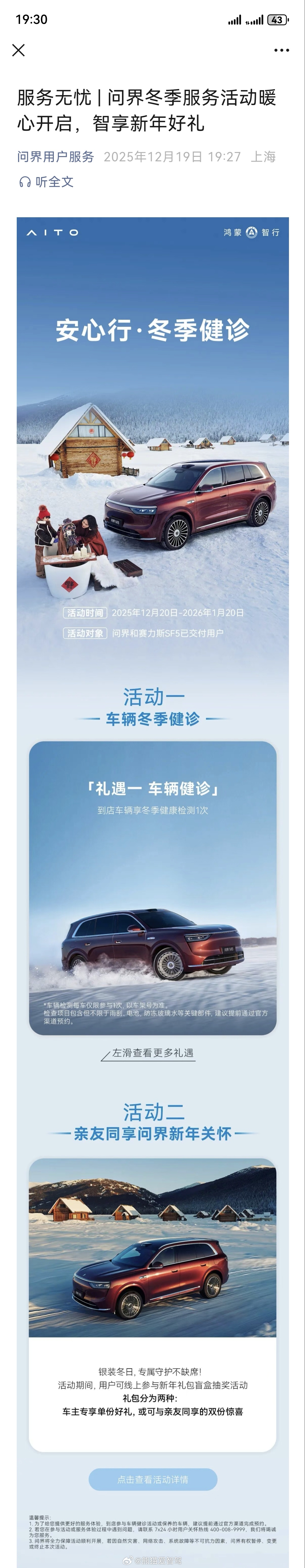 问界汽车 冬季健诊活动来了,12月20日-1月20日,建议问界车友都去检查一下,为了冬天安全行车更放心鸿蒙智行汽场全开新能源汽车在一起鸿蒙智行智慧出行体验智享车生活