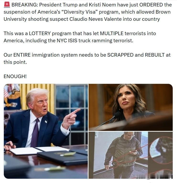 特朗普总统和克里斯蒂·诺姆刚刚下令暂停美国的“多元化签证”项目——正是这个项目,让布朗大学枪击案嫌疑人克劳迪奥·内维斯·瓦伦特进入了美国。 这是一项抽签式的签证计划,已经让多名恐布分子进入美国,其中包括纽约市ISIS卡车冲撞袭击的恐布分子。 到这个地步,美国的整个移民体系都需要被彻底推翻、重新建立。