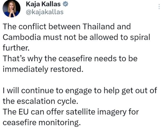 欧盟外交与安全政策高级代表卡拉斯在北京时间12月17日发文称:“绝不能允许泰国和柬埔寨之间的冲突进一步升级。 北京时间12月17日晚,欧盟外交与安全政策高级代表卡拉斯的一则表态,把持续升温的泰柬边境冲突再次推到了国际舆论的风口浪尖。 这位欧盟外交掌舵人直接发文亮明立场:“绝不能允许泰国和柬埔寨之间的冲突进一步升级”,紧接着给出了明确的解决方案——立即恢复停火,甚至主动抛出橄榄枝,提出欧盟可以提供卫星图像用于停火监测,这些话都是她当天上午亲自跟泰国和柬埔寨外交部长通话时当面传递的核心信息。 卡拉斯此刻站出来强势喊话,绝非空穴来风,更不是欧盟想刷存在感,实在是泰柬边境的炮声已经响得让人坐不住了。从12月7日冲突再度爆发开始,短短十天时间里,两国边境就从零星交火变成了实打实的武装对峙,伤亡数字一天比一天难看。 截至16日上午,泰国方面统计的伤亡已经到了17名士兵和16名平民死亡,超过26万民众被迫转移;柬埔寨那边更不好过,光是平民就死了10个,19万多老百姓逃离家园躲进避难所,连吴哥窟所在的暹粒省都遭到了泰国空袭,学校、寺庙、民房被炸得面目全非。 双方互相指责对方先开的火,泰国说柬埔寨“入侵领土”,必须先停火并清理地雷才谈得拢;柬埔寨则反驳泰军用了集束弹药甚至“毒气”,是在打“武装战争和心理战”,还拿社交媒体上的虚假信息说事,说泰国在故意夸大柬方伤亡挑拨离间。 可能有人会问,这俩邻国怎么就打起来了?说起来这事儿盘根错节,不是一句两句能说清的,但核心绕不开那座叫柏威夏寺的千年古刹。这庙建在泰柬边境的扁担山脉上,从19世纪法国殖民时期就埋下了争端的种子。 1904年和1907年的条约划了边界,但对寺庙周边区域的表述模棱两可,1962年国际法院判寺庙归柬埔寨,可周边4.6平方公里的土地归属还是没说清。 就这么着,一座庙成了两国的“民族精神图腾”,柬埔寨说它是“高棉文明瑰宝”,泰国说它是“暹罗文明延伸”,每次关系一紧张,这庙就成了导火索。 今年7月两国就因为这事儿打了一场,上百人伤亡,十万民众疏散,好不容易10月在东盟峰会上签了和平联合声明,才俩月就又打起来了。 这次冲突升级,还有个绕不开的直接诱因,跟电诈打击和泰国国内政治搅在了一起。12月3日泰国总理阿努廷刚宣布,查获了柬埔寨“太子集团”头目陈志等电诈大亨的100亿泰铢资产,折合人民币22.3亿。结果不到5天,边境就开火了。 国际社会早就看出不对劲了。欧盟其实8号就发过声明呼吁克制,现在卡拉斯亲自下场施压,还拿出卫星监测这种实际办法,说白了就是怕战火失控。毕竟泰柬都是东盟成员国,东盟下个月22号就要开外长特别会议专门讨论这事儿,要是真打大了,东盟的“和平解决争端”原则就成了笑话。 美国也插了手,特朗普12号还说自己促成了两国停火,结果泰国当天就否认,柬埔寨更是说第二天就遭到了泰国F-16的轰炸,7枚炸弹炸坏了酒店和桥梁,把美国的面子扔在地上踩。 现在最尴尬的就是两边都下不来台。泰国军方放话“柬埔寨不停火我们就不停”,还宣布切断对柬的石油和战略物资运输,禁止柬埔寨船只进泰国港口;柬埔寨这边也硬气,说要“依法捍卫主权”,洪玛奈政府正靠强硬立场巩固国内支持,根本不可能轻易让步。可真打下去,对谁都没好处。 柬埔寨有上百万劳工在泰国打工,边境贸易是两国经济的重要支柱,现在边境一封,生意全停了,难民营里的人越聚越多,人道主义危机眼看着就要爆发。 卡拉斯的喊话能不能起作用,现在还不好说。欧盟手里的牌不算硬,但卫星监测这个提议算是个实际的台阶——有第三方盯着停火,两边都不用怕对方耍花样。 关键还是看两国能不能放下国内的政治考量,别再拿民族主义当武器。毕竟历史恩怨再深,也比不过老百姓的性命金贵;领土争议再复杂,也能靠谈判桌上的智慧解决,总比在战场上扔炸弹强。