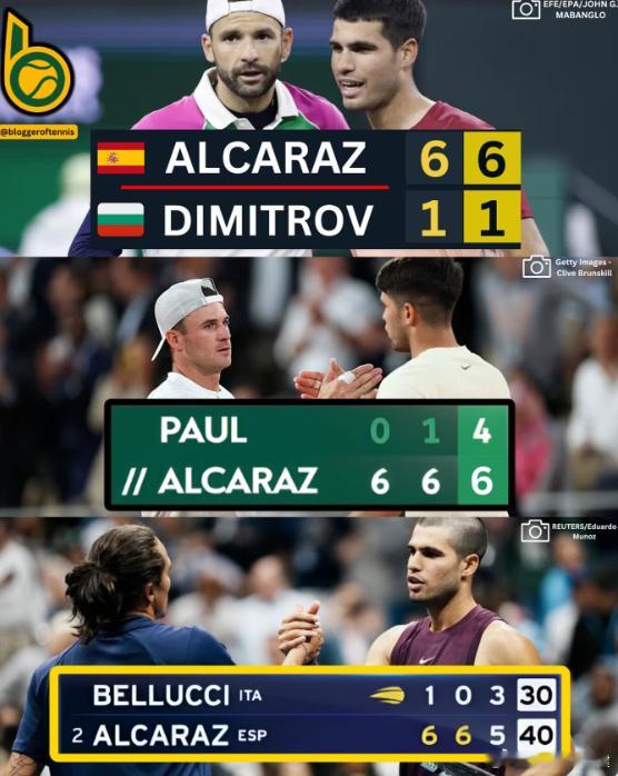 今年阿尔卡拉斯横扫的比分,你们印象最深是?6-1/6-1迪米特洛夫6-0/6-1/6-4保罗6-1/6-0/6-3贝鲁奇阿尔卡拉斯费雷罗结束合作