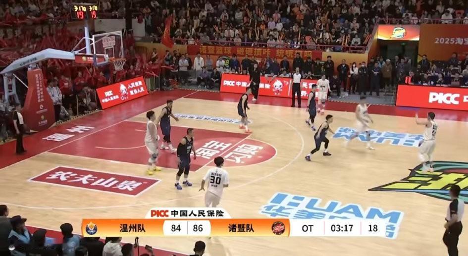 这是今晚温州vs诸暨这场比赛中,诸暨最后一次领先温州。诸暨输掉这场比赛,真的是有点意难平! 这场比赛,本不用打加时的,是裁判硬生生把比赛拖进了加时,本来最后三秒唐局执行罚球的话就不用打加时了,那个球为什么不吹呢? 如果诸暨能在客场终止温州的连胜,在温州主场搞这个庆祝活动,该是多有意义啊。 我猜裁判也是不愿意让这种事情发生吧,所以这种决定比赛最终胜负的犯规,裁判基本都是不吹的!