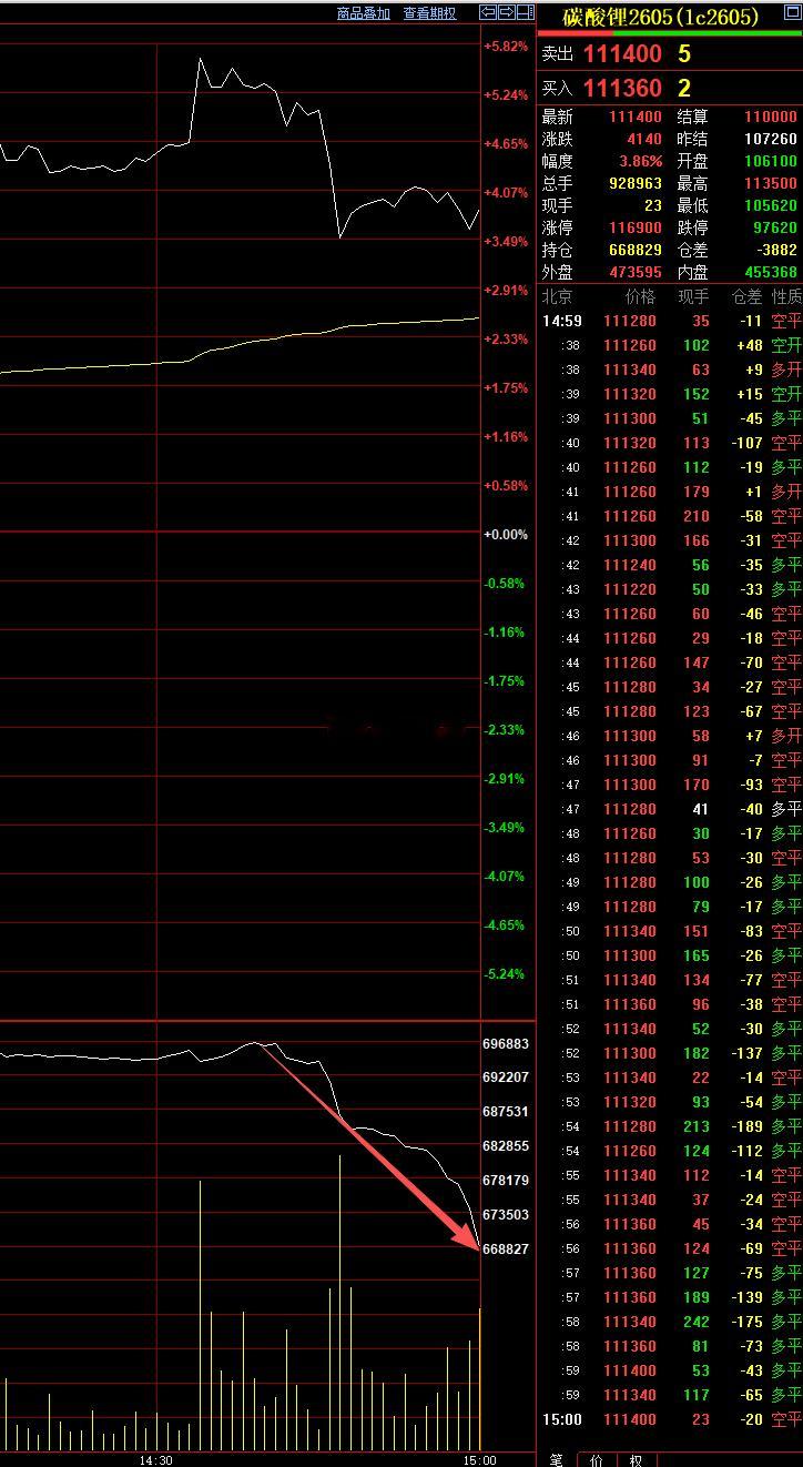 碳酸锂主力合约2605尾盘最后20分钟减仓了2.8万手,盘面回落了2000多点,