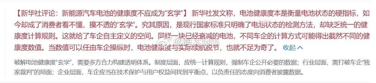 【新华社评论:新能源汽车电池的健康度不应成为“玄学”】 新华社发文称,电池健康度本是衡量电池状态的硬指标,如今却成了消费者看不懂、摸不透的“玄学”。究其原因,是现行国家标准只明确了电池状态的检测方法,却缺乏统一的健康度计算规则。这就给了车企自主定义的空间。同样一块已经衰减的电池,不同车企的计算方式可能得出截然不同的健康度数值。当数值可以任由车企操纵时,电池健康度与实际续航脱节,也就不足为奇了。