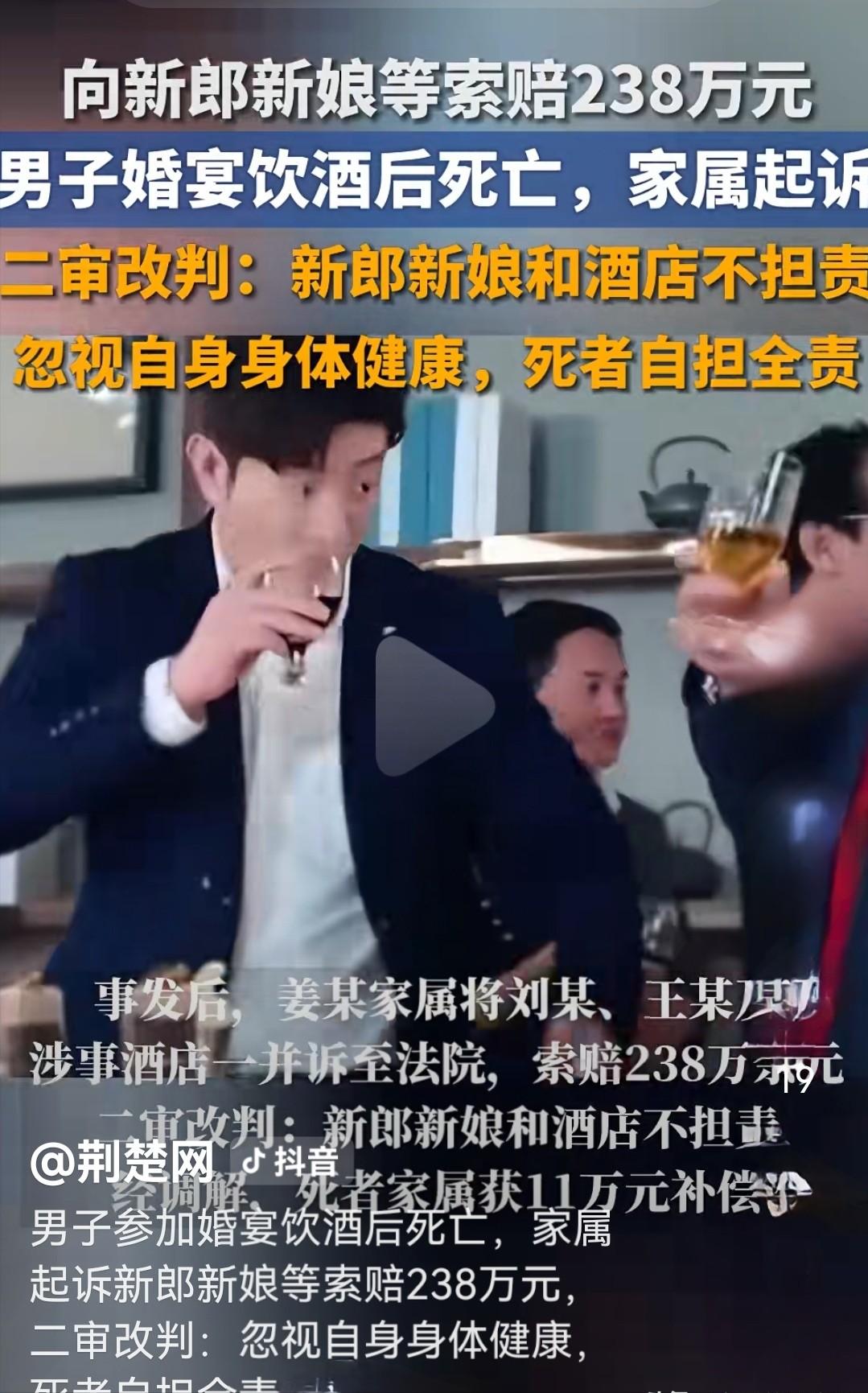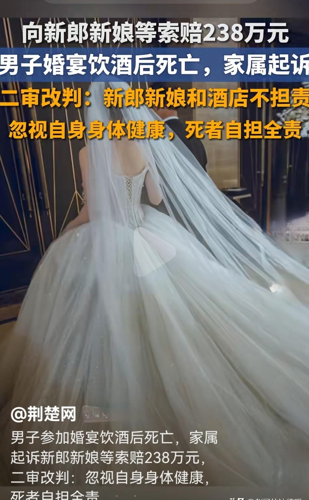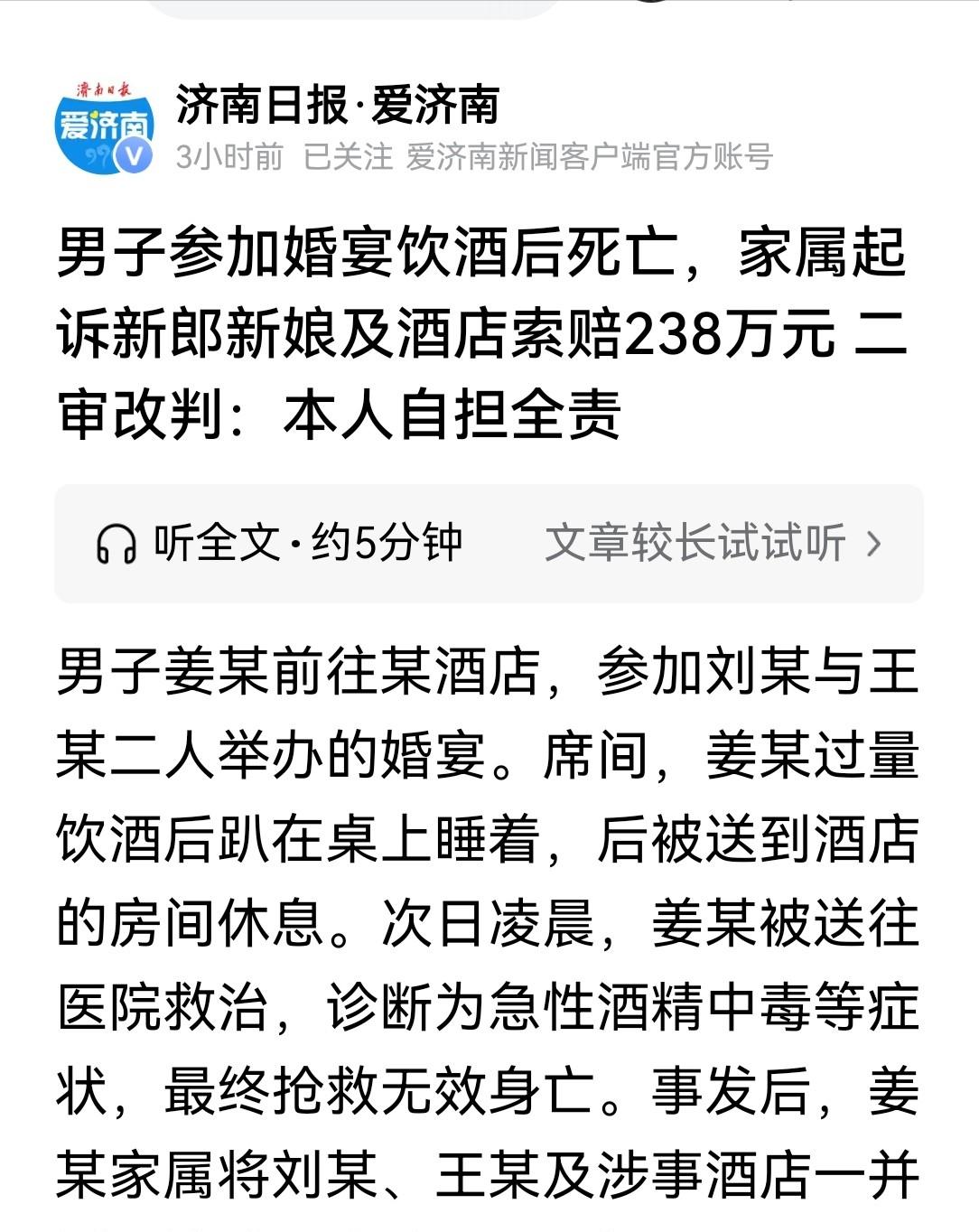 这次讹人没成功!北京大兴,37岁男子去参加生意伙伴的婚宴,期间因为醉酒被送到酒店房间休息,酒店保洁发现不对劲后当即拨打120急救电话,第二天上午,男子经抢救无效不幸离世,死因为窒息死亡。家属将新郎、新娘以及酒店告上法庭,索赔238万余元。一审判决,新人夫妇赔偿58万多元,酒店赔偿10万,二审改判结局令家属意想不到。 事情的起因要从一场热闹的婚宴说起。37岁的男子受邀参加生意伙伴的婚礼,婚宴上难免少不了推杯换盏,男子席间饮酒过量,很快就醉得不省人事。 考虑到他无法自行回家,新郎新娘安排人员将他送到附近的酒店开了房间休息,本以为只是让他好好睡一觉醒酒,没想到这成了永别。 当天晚上,酒店保洁人员按照流程进行客房巡查时,发现男子所在的房间情况不对劲,敲门许久没有回应,透过门缝观察到男子状态异常。 保洁人员立即将情况上报给酒店管理层,工作人员第一时间赶到现场,尝试联系男子无果后,果断拨打了120急救电话。 急救人员赶到后迅速对男子展开抢救,随后将他送往医院接受进一步治疗。经过一夜的全力救治,男子还是没能挺过来,第二天上午,医院宣布他经抢救无效死亡。 后续的尸检结果显示,男子的死因为醉酒后窒息,这一结论让家属难以接受,悲痛之下将矛头指向了新郎新娘和酒店。 家属认为,新郎新娘作为婚宴的主办方,没有尽到劝阻过量饮酒的义务,事后安置也存在疏忽;酒店则没有及时发现男子的危险状态,延误了最佳抢救时机。 基于这些理由,家属向法院提起诉讼,要求三方共同赔偿医疗费、死亡赔偿金、精神损害抚慰金等各项损失,共计238万余元。 一审法院审理后认为,新郎新娘作为宴请方,对饮酒者负有合理的安全保障义务,虽然安排了人员将男子送医住宿,但未能尽到充分的安全注意义务; 酒店在客房巡查中发现异常后虽及时报警,但在安全保障措施上仍有提升空间。最终一审判决新郎新娘赔偿家属58万余元,酒店赔偿10万元,其余损失由男子自行承担。 一审判决下达后,新郎新娘和酒店均表示不服,提起了上诉。二审法院经过更细致的审理,还原了整个事件的关键细节,最终做出了截然不同的判决。 法院认为,男子作为完全民事行为能力人,应当清楚过量饮酒会对自身健康造成危害,却在婚宴上不加节制地饮酒,这是导致其醉酒窒息死亡的根本原因。 关于新郎新娘的责任,二审法院指出,两人在男子醉酒后已尽到合理的安置义务,安排人员将其送至酒店休息,并非对其不管不顾; 而酒店方面,保洁人员按时巡查并及时发现异常,工作人员第一时间拨打急救电话,已经履行了合理的安全保障职责,不存在延误抢救的情况。 综合这些因素,二审法院撤销了一审判决,改判男子自行承担全部责任,新郎新娘和酒店无需承担赔偿义务。 这一反转结果让家属始料未及,也引发了全网的广泛讨论。不少人认同二审的判决,认为成年人应当对自己的行为负责,过量饮酒本身就是危险行为,不能把自身过错导致的后果归咎于他人;也有部分人表示理解家属的悲痛,觉得婚宴主办方和酒店多少应该承担一点责任。 值得注意的是,醉酒后窒息的风险远比很多人想象的要高。酒精会严重抑制大脑中枢神经,导致咳嗽、吞咽等反射减弱甚至消失,一旦发生呕吐,呕吐物很容易在重力作用下堵塞气道,引发窒息。 更危险的是,醉酒者处于昏睡状态时无法感知危险,也无法主动调整体位,这也是此类悲剧频发的关键原因。 相关健康科普数据显示,醉酒后仰卧是最危险的体位,正确的做法是将醉酒者置于侧卧位,下方手臂伸直,上方腿屈曲支撑身体,保持头部后仰以开放气道, 同时必须有清醒的人全程看护,定时检查其呼吸和面色。很多人误以为“睡一觉就好”,却不知道醉酒后的沉睡阶段,正是窒息风险的高发期。 这场悲剧也给所有人敲响了警钟,无论是参加宴席还是朋友聚会,都应做到适量饮酒、量力而行。作为宴请方,固然需要尽到合理的提醒和安置义务,但更重要的是,每个人都要对自己的生命健康负责,切勿因一时贪杯酿成无法挽回的后果。 对此,你们有什么看法,欢迎评论留言~