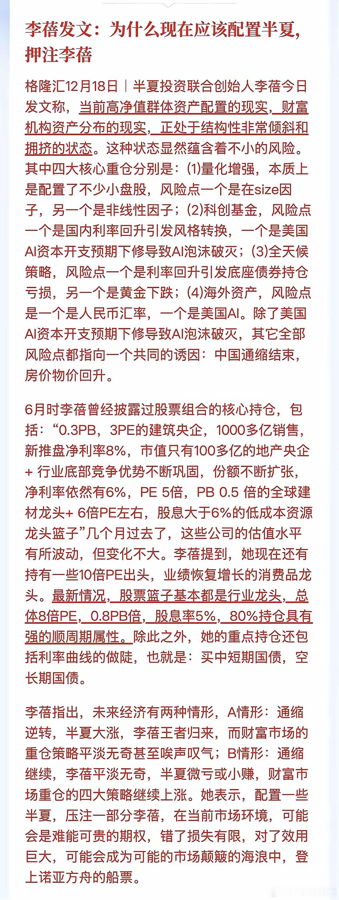 投资女神李蓓发文,已押注中国央企龙头房企和建筑建材龙头企业。大部分房企会死,但是房地产行业不会死,未来如果经济变好,市场份额会被活下来的房企占据,她的投资标的将会大涨。如果市场依然通缩,只会小亏,并且亏时间不亏钱,世间万物都是物极必反的,涨多了就会跌,跌多了就会涨。刚需改善买房,涨了你赚了,亏了还是你家,早买早享受,但要量力而行。
