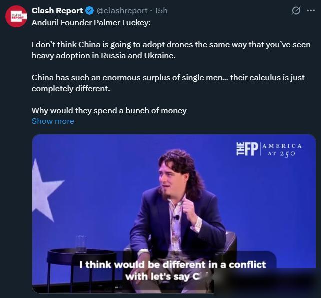 西方人对中国的无知刷新出了新高度!美知名国防技术公司创始人帕尔默·拉基,在访谈中大肆贬低中国无人机军事化能力。 ​ 据他推测“中国不会像俄罗斯和乌克兰那样大规模运用无人机(战斗)”,理由是中国有“大量的单身男性”。 ​ 这种言论简直离谱到家了。 ​ 不仅暴露了对中国军工发展的无知,更透着一股陈腐的思维异味。 ​ 把人口结构和军事科技简单挂钩?这脑回路清奇。 ​ 中国无人机发展到了什么水平,国际市场上看得清清楚楚。 ​ 翼龙、彩虹系列无人机,早已在中东、北非多个实战场景中得到检验。 ​ 性能如何,用户心里有杆秤。 ​ 这位美国公司创始人,难道从不看新闻吗? ​ 中国无人机不仅外销多国,自身列装规模和技术迭代速度更是全球瞩目。 ​ 无人作战体系、蜂群战术、高空长航时无人机,哪一项不是重点发展的方向? ​ 说中国不重视无人机,等于说现代军队不重视信息化。 ​ 荒谬至极。 ​ 至于所谓“单身男性多就不发展无人机”的论调,更是滑天下之大稽。 ​ 现代战争打的是体系,是科技,是效率。 ​ 岂能用人命去填?这种观念还停留在一战时期吧。 ​ 解放军推动科技强军,智能化、无人化是明确趋势。 ​ 各类演习中无人机早已是常客,承担侦察、打击、评估等多种任务。 ​ 这位帕尔默·拉基先生,恐怕需要好好补补课。 ​ 不是中国不会大规模用无人机,而是中国无人机的发展路径和应用理念,可能已经超出了他的理解范围。 ​ 我们发展无人机,不是为了替代人,是为了更好地保护人。 ​ 是为了让战士远离不必要的危险,提升作战效能。 ​ 这种以人为本的军事哲学,他可能不懂。 ​ 西方某些人总是带着滤镜看中国。 ​ 要么夸大威胁,要么贬低进步。 ​ 说到底,是一种根深蒂固的傲慢与偏见。 ​ 认为自己的模式才是先进的,别人的选择都是落后的。 ​ 这种心态要不得。 ​ 世界军事变革日新月异,无人机只是其中一个缩影。 ​ 中国坚持走自己的路,不盲从,不浮躁。 ​ 成果摆在那里,不是几句轻蔑的猜测就能否定的。 ​ 最终,战场是最诚实的考官。 ​ 任何轻视对手、固步自封的言论,都会在现实面前碰得粉碎。 ​ 尊重事实,放下偏见,才是明智之举。 ​ 科技发展是为了造福人类,守护和平。 ​ 这个道理,放之四海而皆准。 ​ MCN双量进阶计划