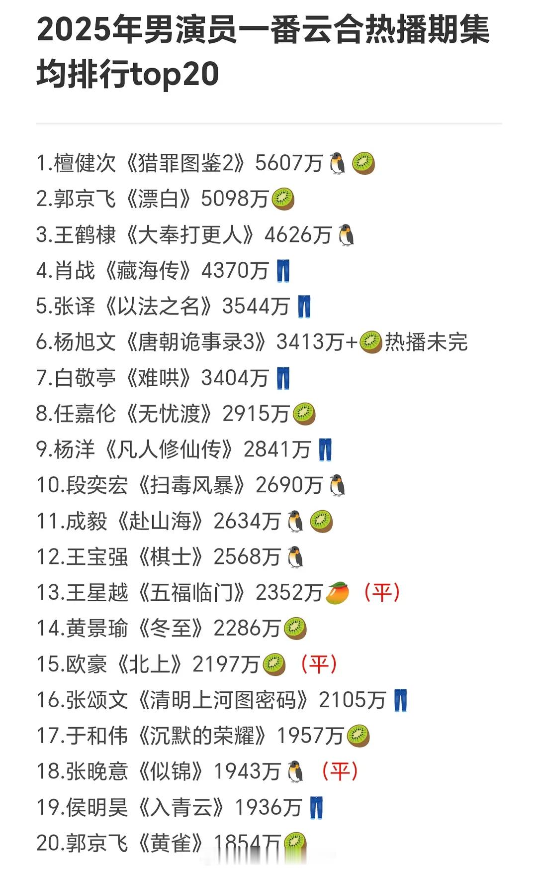 2025年男演员云合一番热播期集均排行檀健次《猎罪图鉴2》第1️⃣