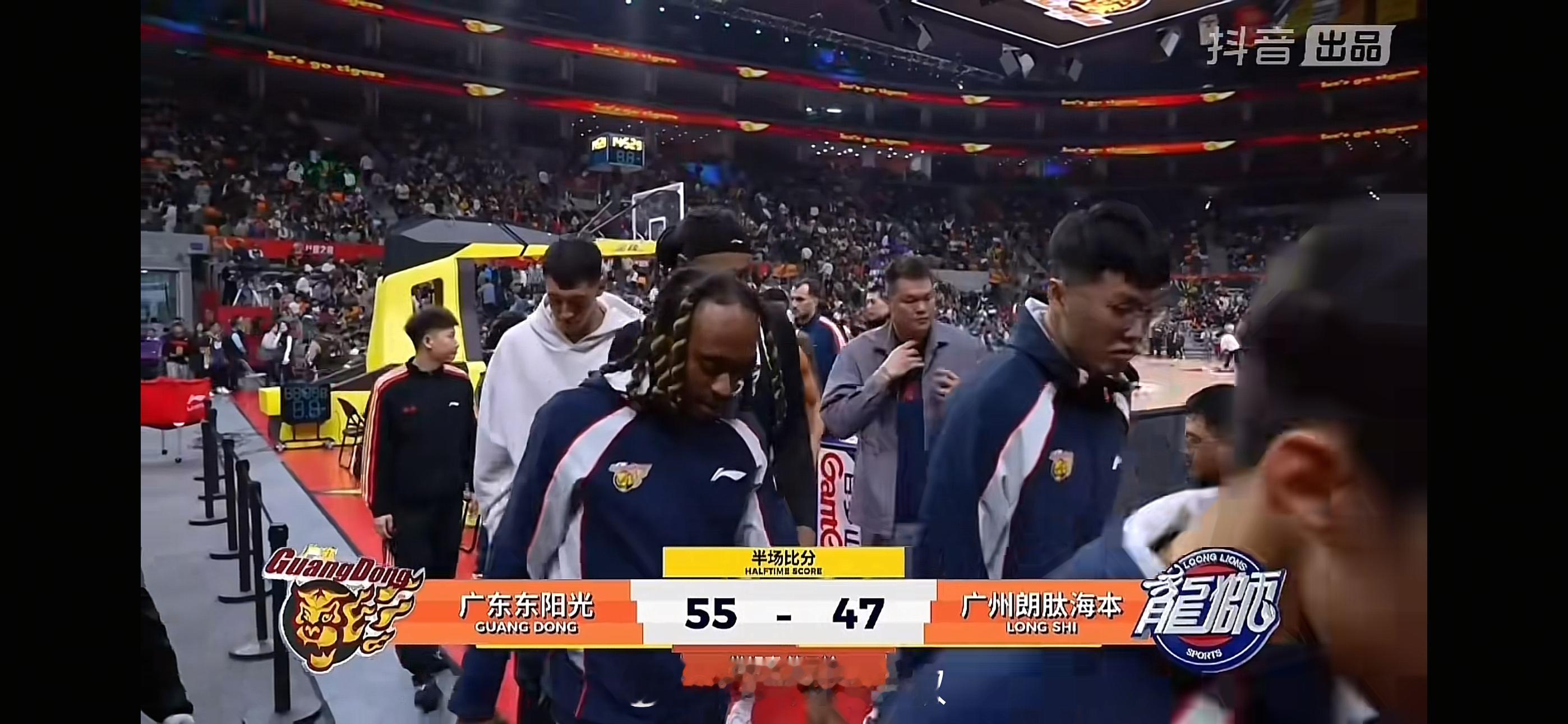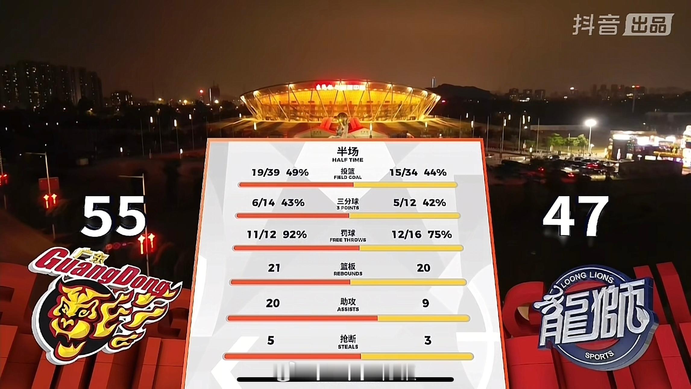 广东男篮半场得55分,广州龙狮得47分,广东领先8分。 ◦ 广东投篮命中率49%(19/39),三分命中率43%(6/14),罚球命中率92%(11/12); ◦ 广州投篮命中率44%(15/34),三分命中率42%(5/12),罚球命中率75%(12/16)。 ◦ 篮板:广东21个,广州20个,差距微弱; ◦ 助攻:广东20次,广州仅9次,广东的团队配合优势明显; ◦ 抢断:广东5次,广州3次,广东的防守压迫性更强。