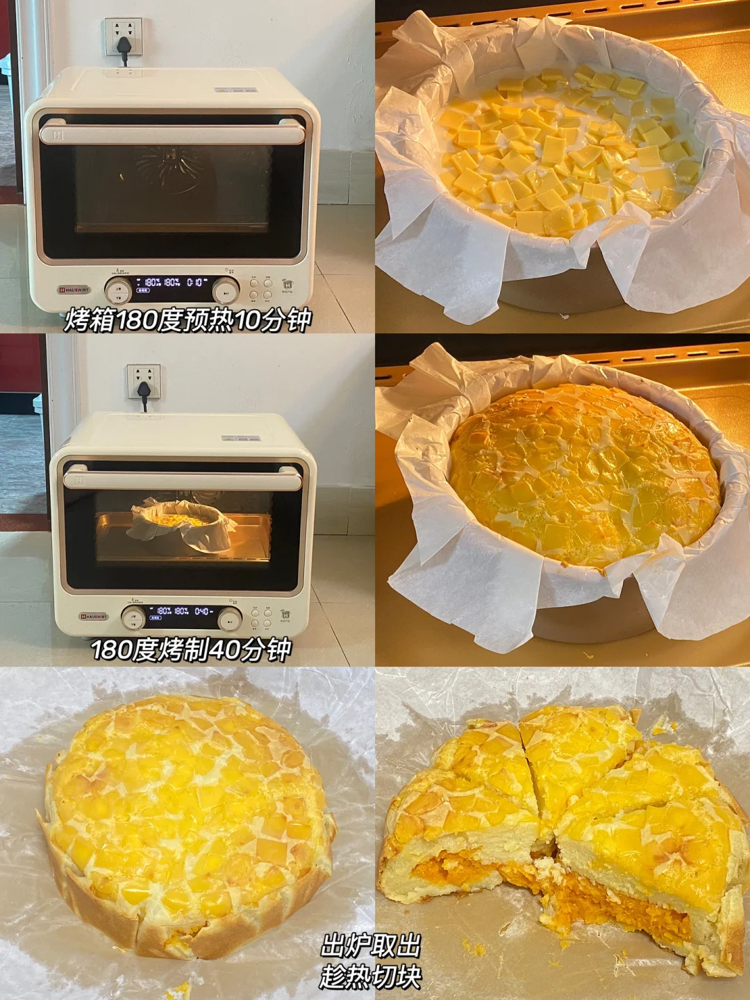 4.烤箱提前预热10分钟,180度烤制40分钟,出炉取出,趁热切块。