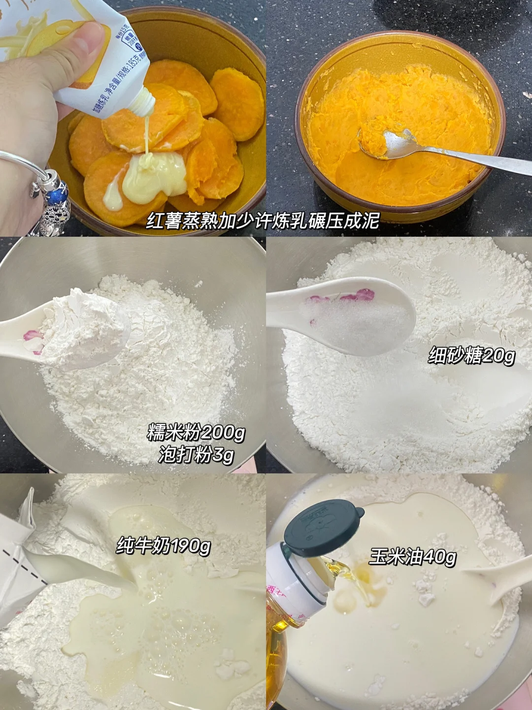 🌷食材:红薯半个,炼乳,糯米粉200g,泡打粉3g,玉米油40g,牛奶190g,细砂糖20g,鸡蛋1个,芝士片3片。