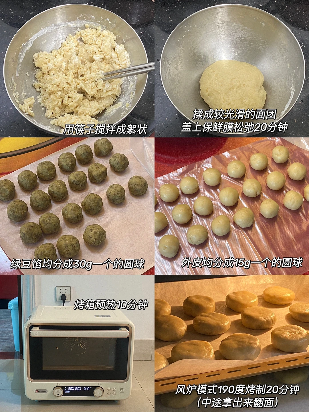4.外皮食材全部倒入大碗中,用筷子搅拌成絮状,下手揉成较为光滑的面团,盖上保鲜膜松弛20分钟,均分成15g一个的小圆球。