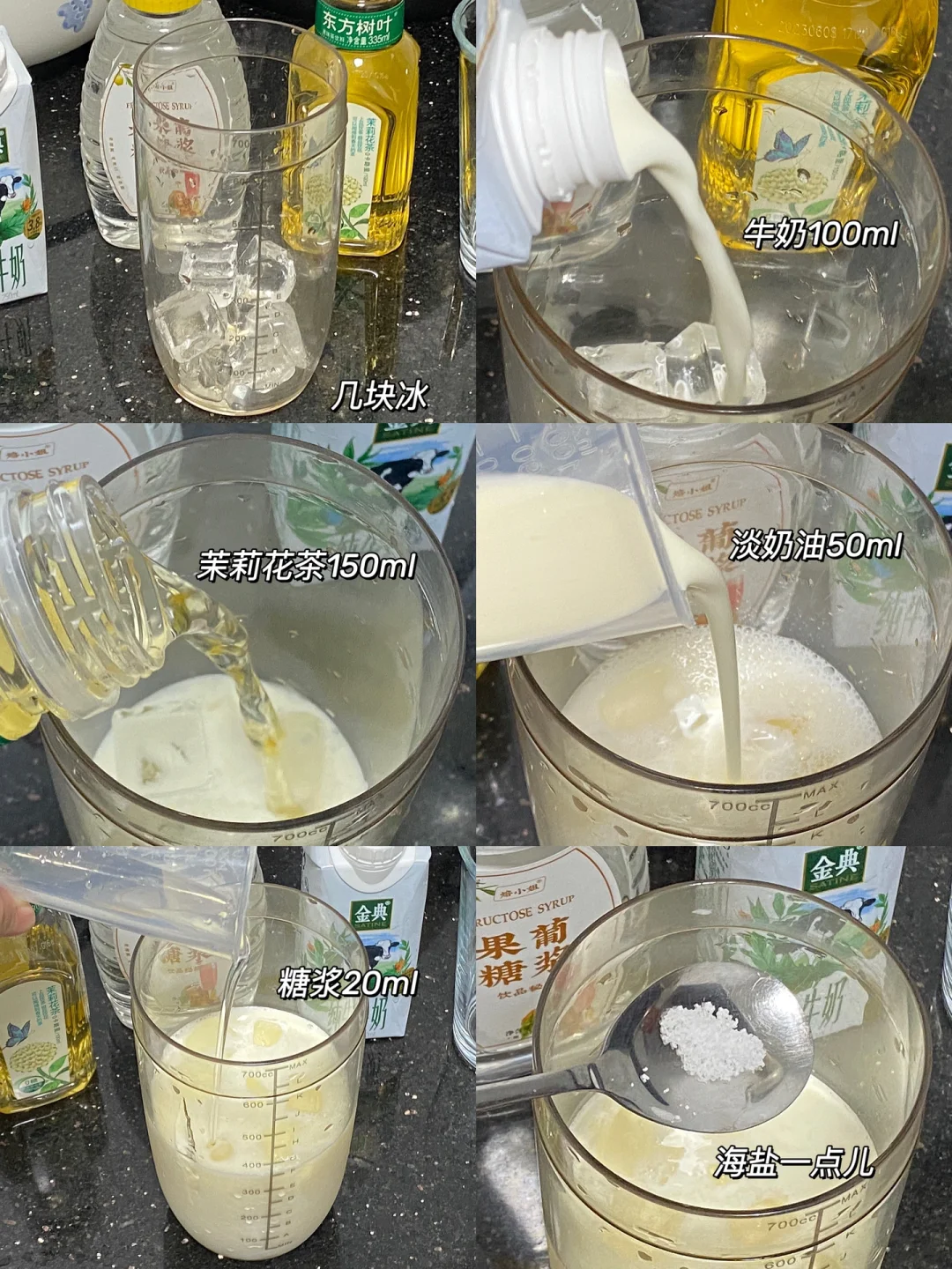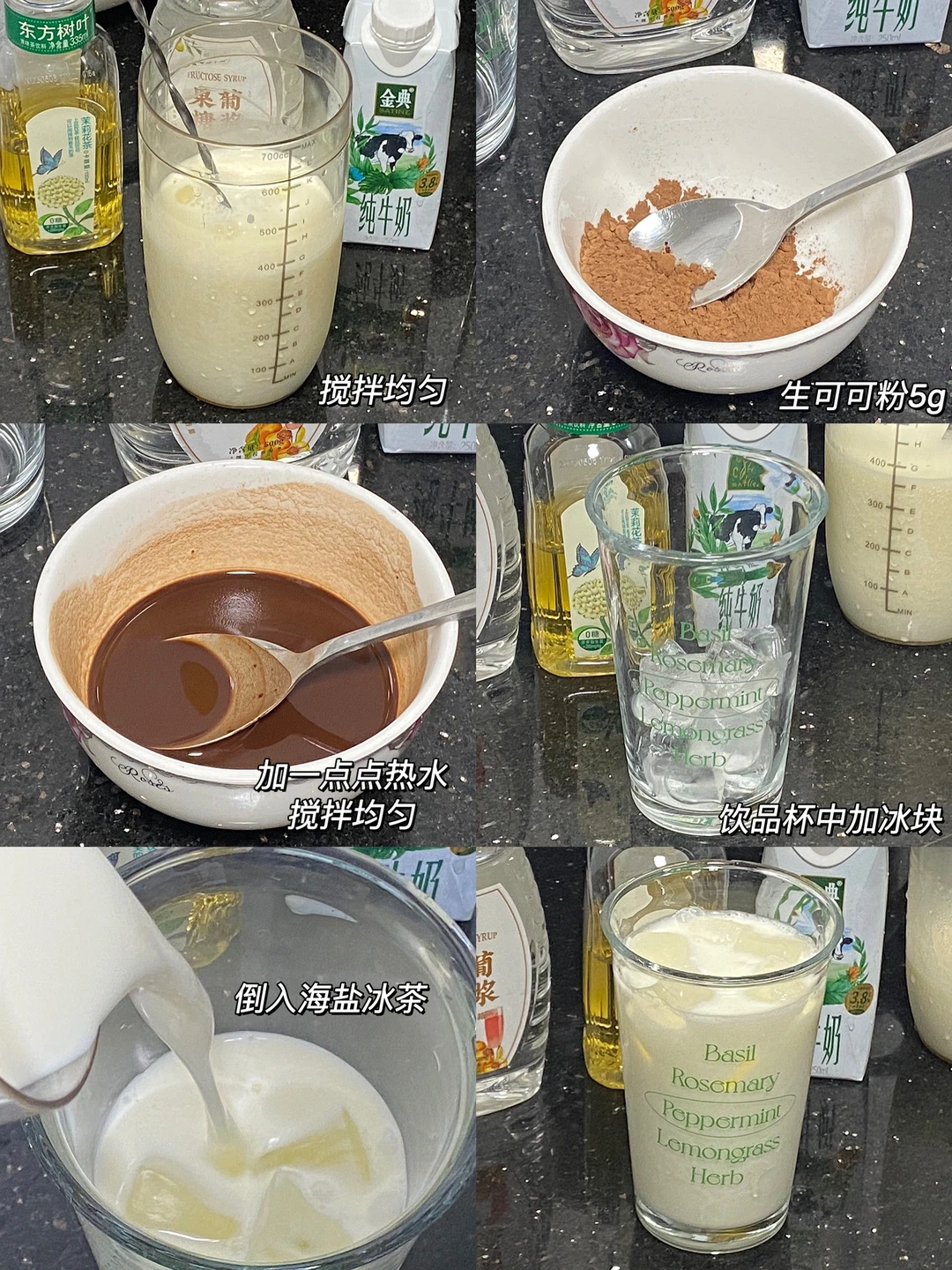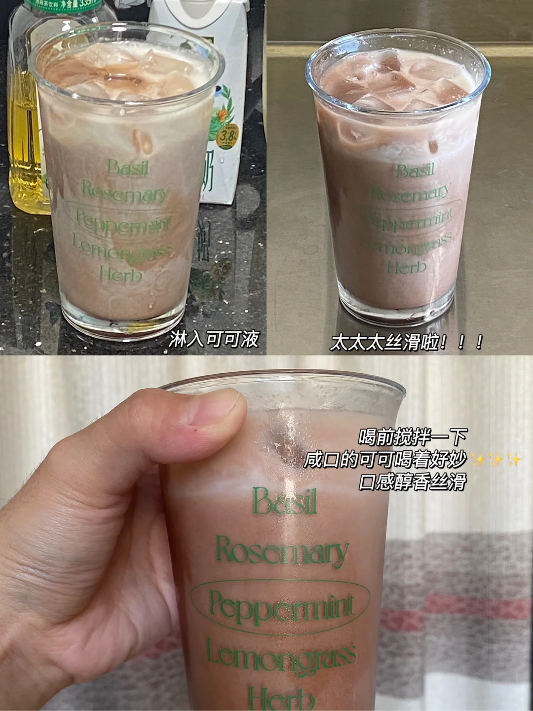 🌷食材:牛奶,茉莉花茶,淡奶油,糖浆,海盐,生可可粉。 🌷做法:1.雪克杯中加入几块冰、倒入牛奶、茉莉花茶、淡奶油、糖浆、海盐搅拌均匀备用。 2.生可可粉5g,加入一点点热水搅拌均匀。 3.饮品杯中加冰,倒入调好的海盐冰茶,淋入可可液。 🌷太太太丝滑啦!!!咸口的冰可可惊艳住了,喝前记得搅拌一下,口感醇香丝滑太好喝了[赞R][赞R][赞R]