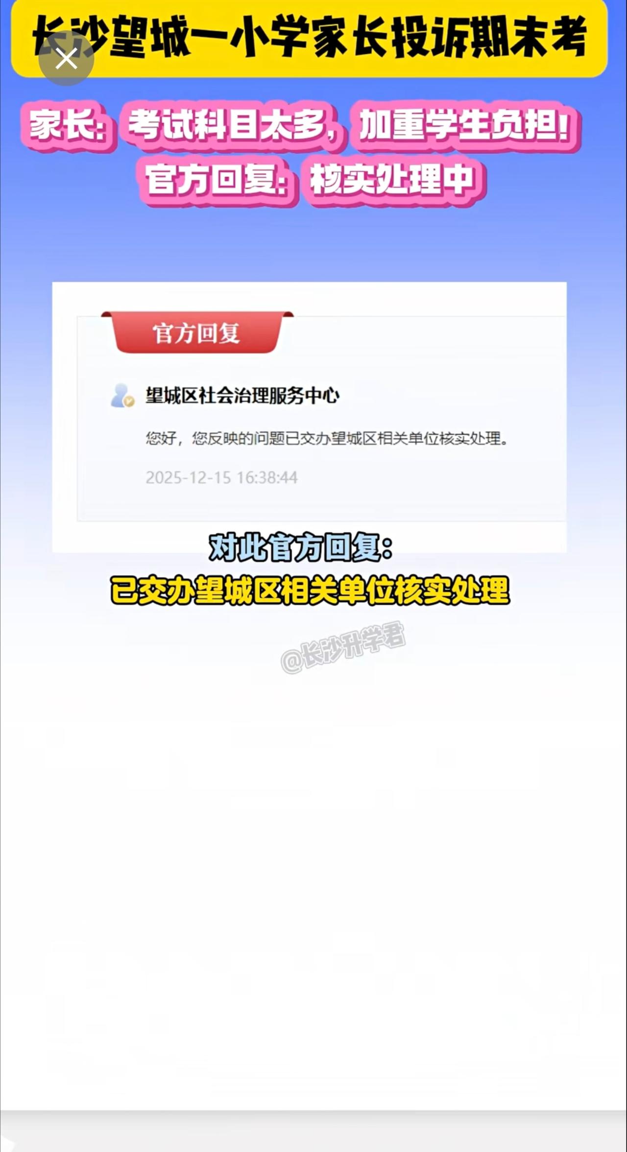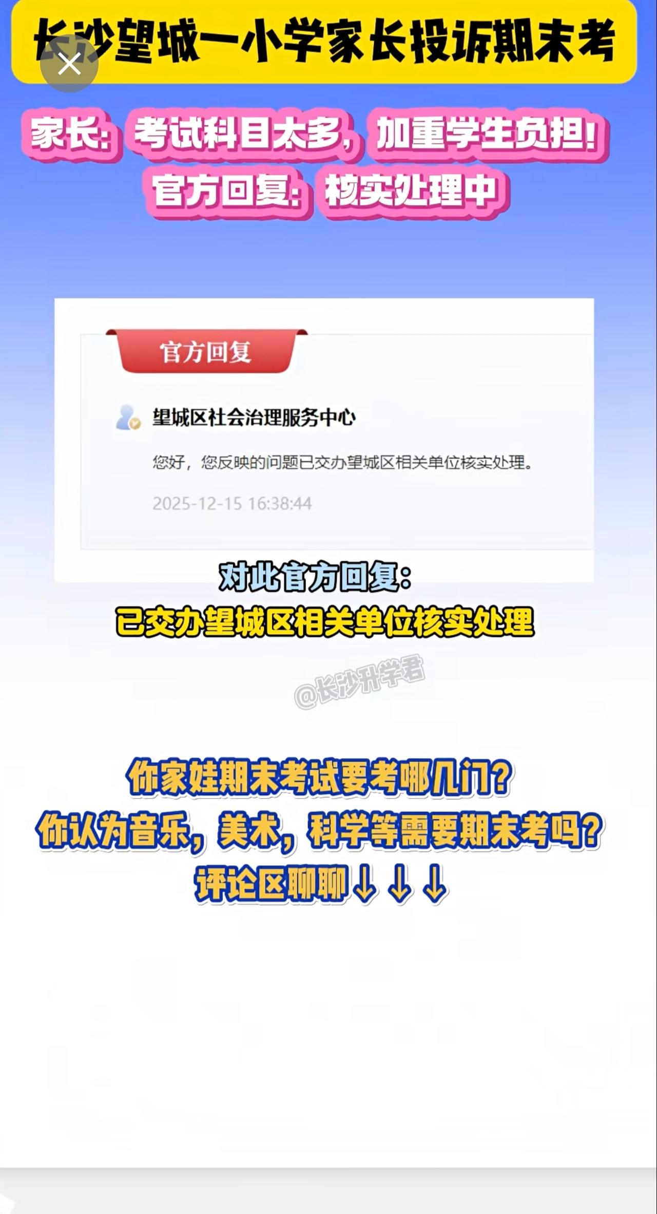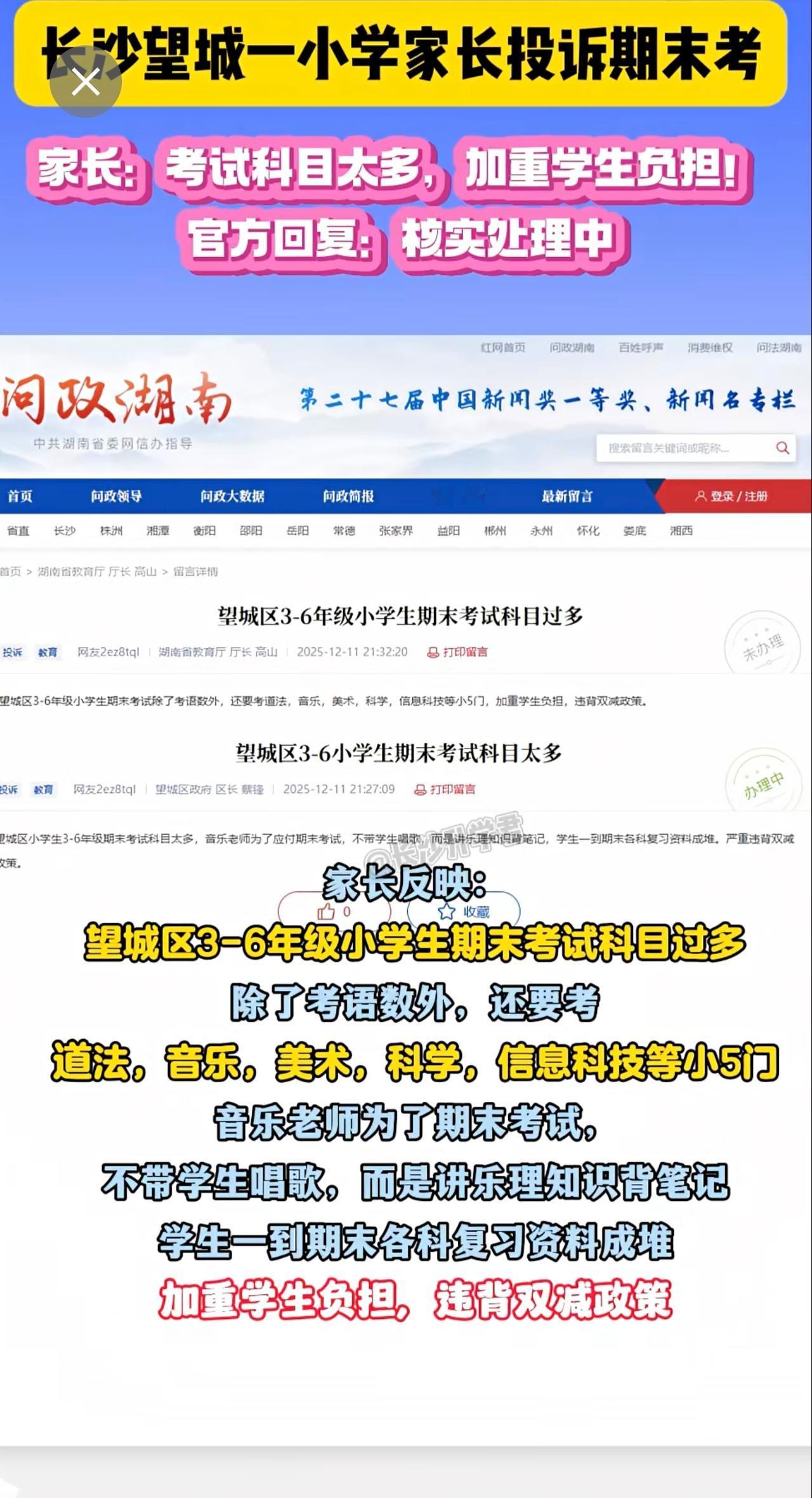 长沙望城区小学期末考科目太多被家长投诉!家长反映一到期末资料成堆、加重学生负担!对此你怎么看?你家小孩期末考几门?评论区聊聊~