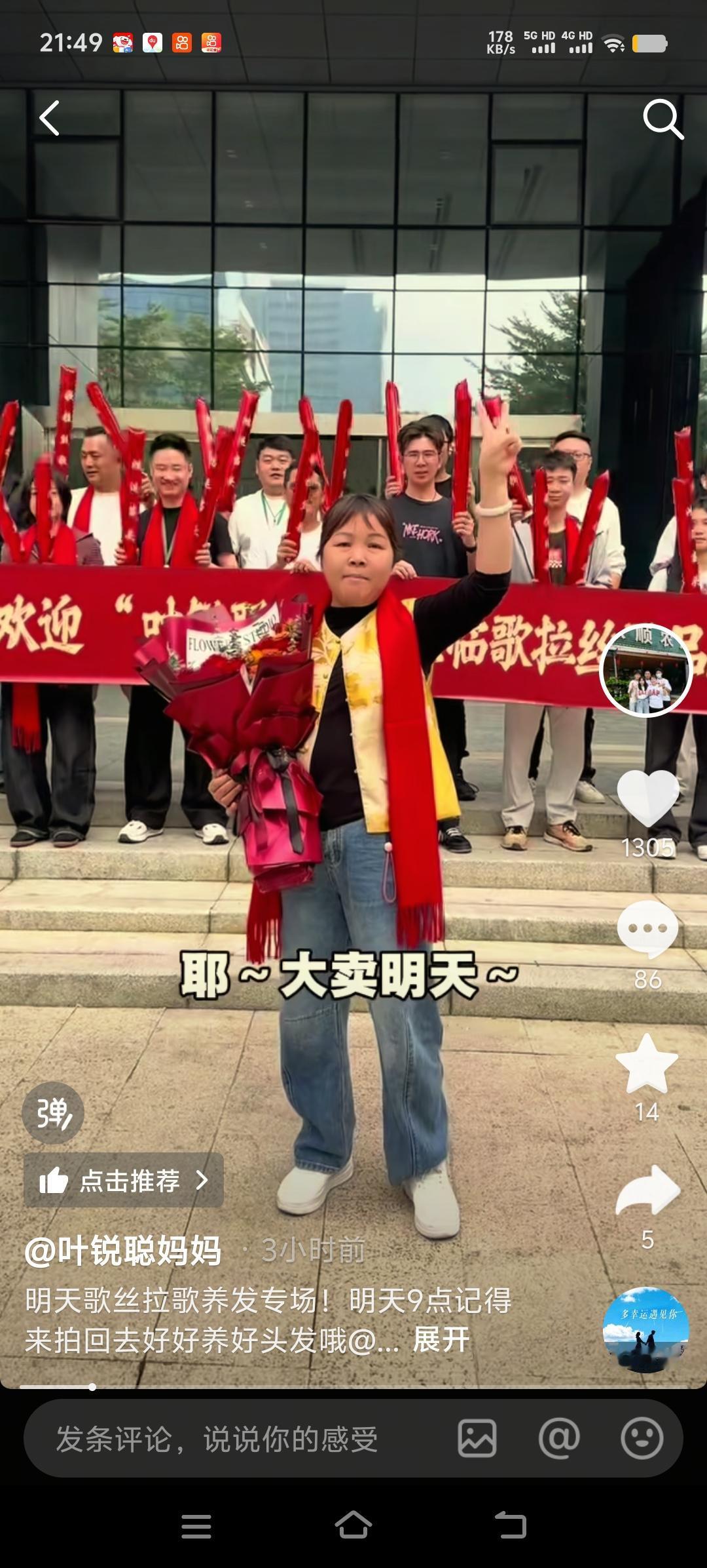 叶锐聪妈妈今天直播带货洗化品牌[赞],来到厂家,叶锐聪妈妈受到了热烈的欢迎,终于放下心里的包袱,安心的做自己想做的事情了。 现在看来锐聪妈妈更多的精力放在了自媒体方面,带带货,拍拍视频,直播跟大家聊聊天,估计家里的农庄更多的交给姐夫了[比心] 真心喜欢大喇叭东姐的开朗性格,马上元旦了,也期待叶宝能回家跟爸爸妈妈团聚,共同开启美好新年[玫瑰]