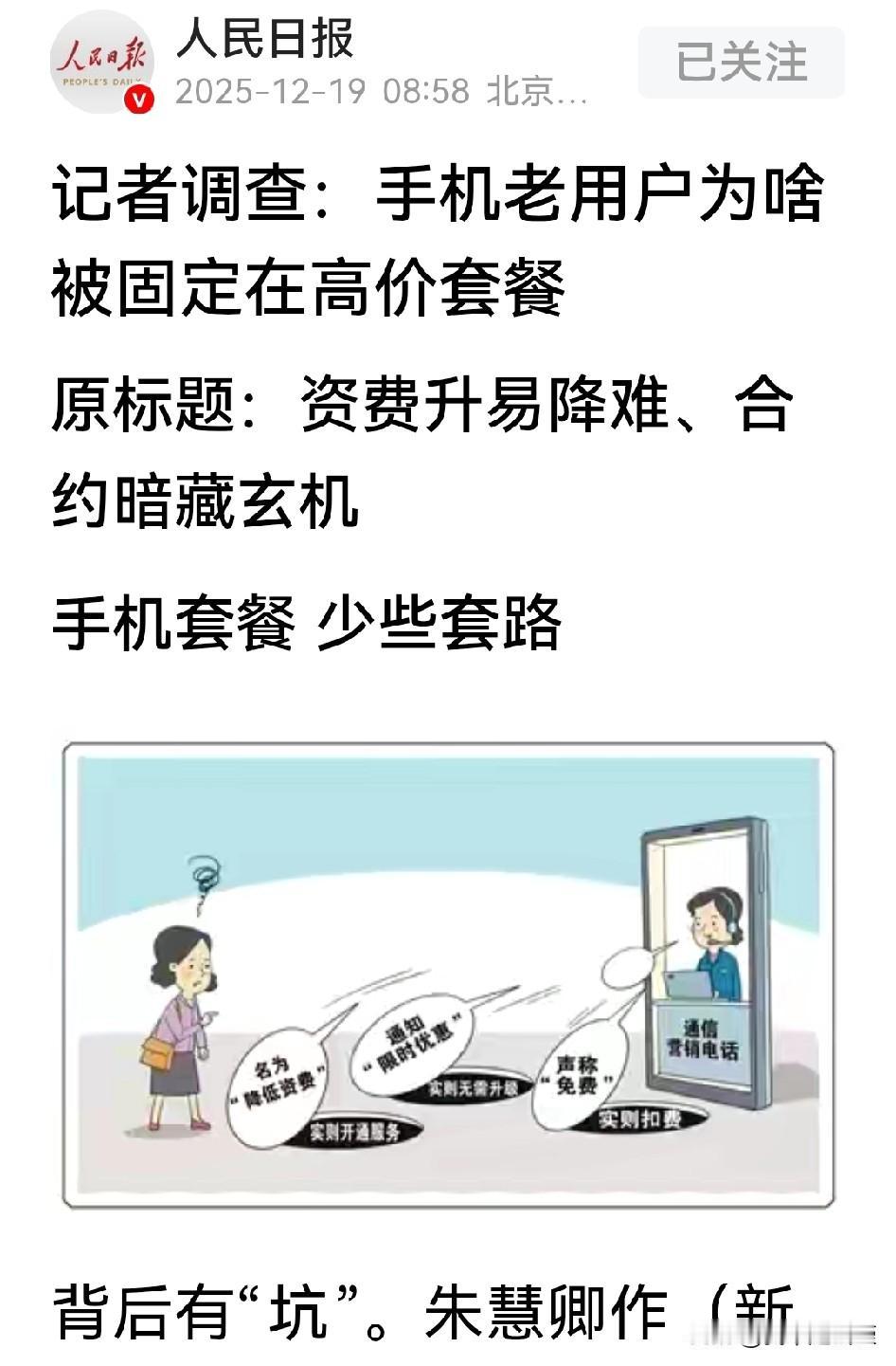手机资费套餐里的“啃老族”。人民日报这篇文章算是道出了大家的共同心声。 自从老罗发了关于他家电信流量的朋友圈后,大家对老罗的感受那是感同身受。不过老罗是凭实力“约架”的,感同身受的大家似乎只能“附和”。 不过情况也并非如此,人民日报专门发了一篇关于手机资费的文,也从根源扒出了运营商的口罩,底下评论区都是自己的遭遇。 调查发现运营商喜欢啃老,那是啃的相当实在和心安理得。全社会都在痛斥“啃老族”现象,为何运营商却屡试不爽且在助长这个陋习呢? 说白了就是“利字当头”!啃老族大家都知道,衣来伸手,饭来张口的,只要被啃的对象还在,就一直能啃下去,他们觉得理所当然。 那怎样去彻底改变啃老族的现状呢?除非有一天被啃的忍无可忍了,或者说是觉悟了,或者说外力的干涉,让啃老族感觉到了危机不得不改变现有啃的方式。 这需要一个过程,好的是文末说有了外力的加入和被啃者的呐喊,看来事情有转机了,这是好事。当然了更希望这种好事快快降临,彻底纠正啃老的陋习。啃老族和被啃者也就平衡了!!!
