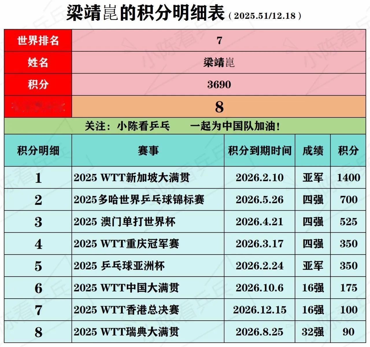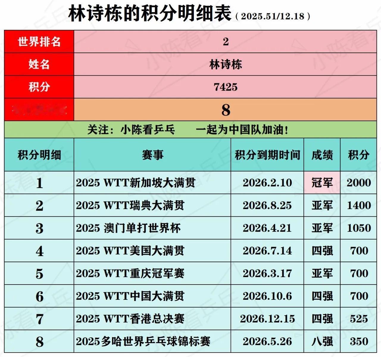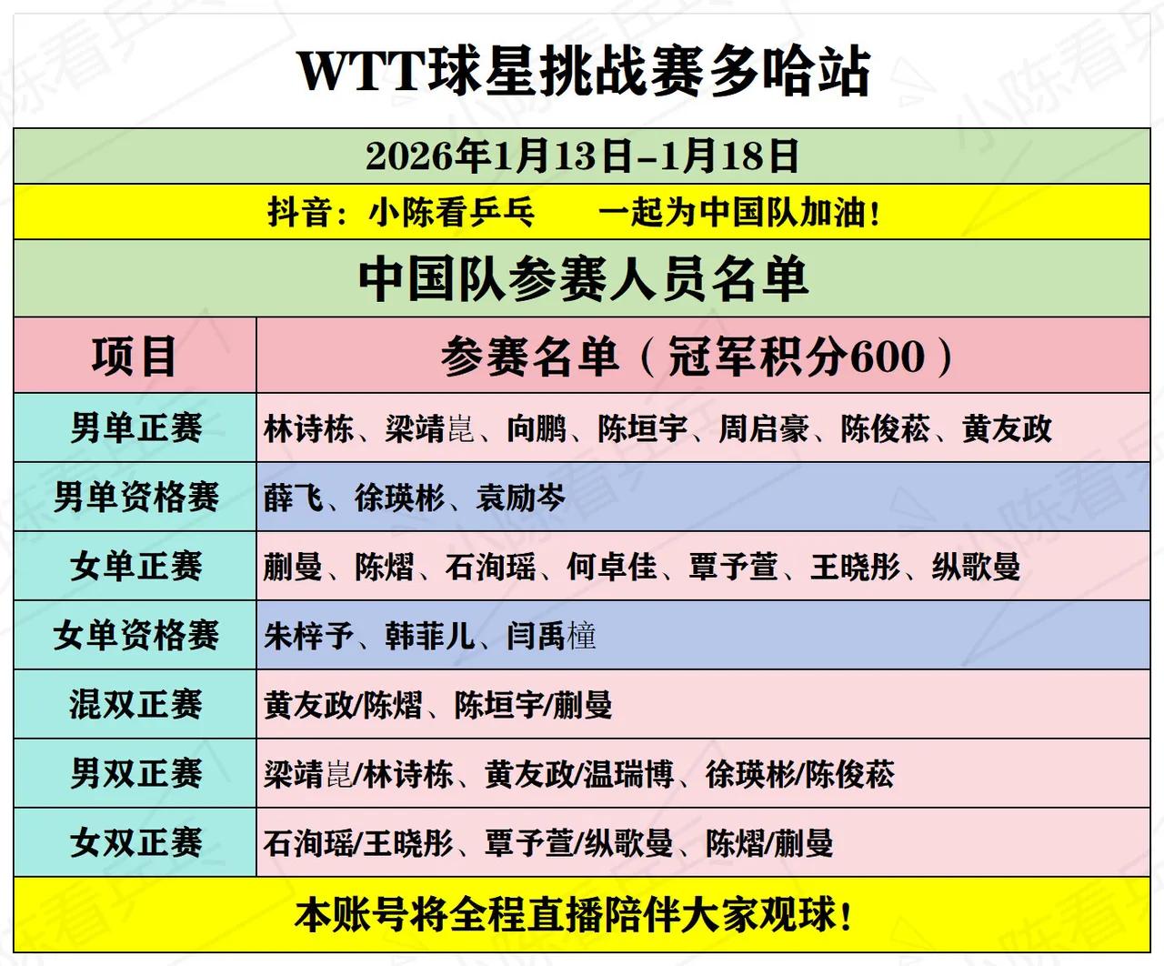 为了备战2026伦敦世乒赛、亚洲杯和亚运会国乒男队拼了! 年初多哈球星挑战赛、马斯喀特常规挑战赛,国乒主力轮休。男队八强不入。 小石头新加坡大满贯2000积分即将到期,大胖排名已到第七……,以赛代练,挣积分,为抽签处于有利的位置,国乒大动员,参加中等级别的WTT挑战赛。 2026年的卡塔尔多哈冠军赛(1000个积分),卡塔尔多哈球星挑战赛(600个积分),安曼马斯喀特常规挑战赛(400个积分),真是接二连三参赛! 这在2025年初,是难觅国乒主力的! 区区400个积分的常规挑战赛,林诗栋、梁靖崑都来了。 对小石头好一点,减负了,不打混双了! 我想这与香港总决赛林诗栋/蒯曼输给韩国林钟勋/申裕斌无关吧! 球星挑战赛混双是陈垣宇/蒯曼组合了。当然全运会这对“江苏”组合获得了混合双打亚军,实力不弱。 但距混合双打前三甲尚有时日!