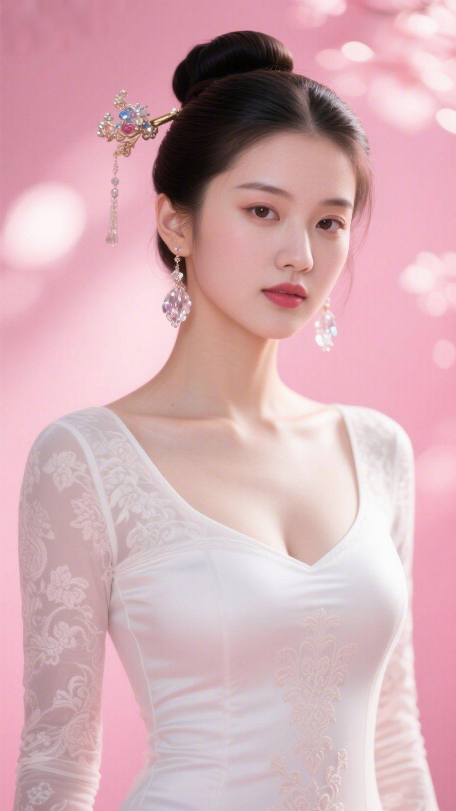《粉光里的雅韵》 暖粉柔光轻笼发间金簪,碎钻流苏随呼吸微晃,恰似春夜星子栖在鬓边。 她着月白纱裙,绣纹是缠枝莲的柔,袖间纹样如雾中舒展的云。眉梢眼尾浸着清宁,像把江南软风织进了眉目里。 没有浓艳的装饰,只凭金簪的古意、纱裙的温婉,衬得神色愈发澄澈。唇上淡绯如花瓣沾了朝露,连安静的姿态里,都裹着不张扬的软。 原来东方的柔从不是刻意的模样,是金簪碰纱袖的轻响里,藏着的清和妥帖,是落在眼底的温,是浸在骨里的雅。 东方雅韵 温柔国风