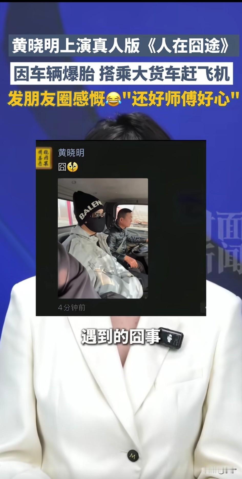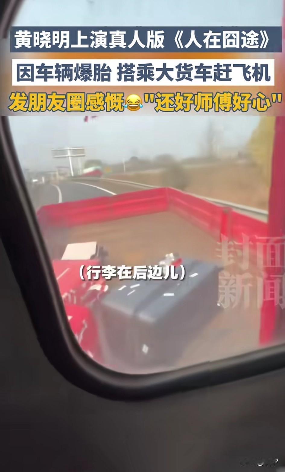 演员黄晓明上演了现实版的《人在囧途》,因为要赶去机场, 刚坐上了一辆网约车, 没想到走到半路车爆胎了, 没办法他们只能下车, 看到有大货车司机后就伸手求助, 大货车司机也是非常热心, 将他们带去了机场, 他们的行李就扔在大货车的后面, 期间黄晓明还要感谢货车大哥, 本以为赶不上飞机的他们, 最终在货车大哥的努力下成功赶上了飞机,之后黄晓明发了朋友圈, 感谢热心肠的货车司机! 这段有趣的经历被网友调侃, 这才是真实版的人在囧途, 大家对于这事怎么看? 黄晓明 黄晓明恋情 黄晓明出场费 黄晓明公开道歉 黄晓明双胞胎 李玉刚,黄晓明