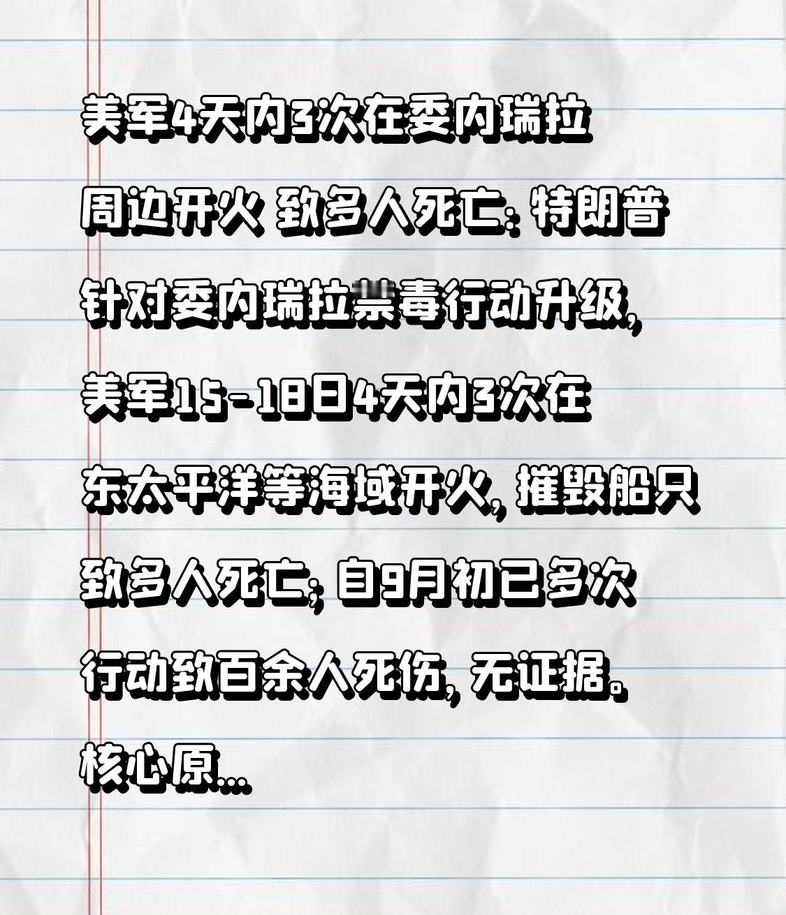 美军4天内3次在委内瑞拉周边开火 致多人死亡:特朗普针对委内瑞拉禁毒行动升级,美军15-18日4天内3次在东太平洋等海域开火,摧毁船只致多人死亡;自9月初已多次行动致百余人死伤,无证据。核心原因是政治(转移国内矛盾、巩固选民)和战略(门罗主义特朗普推论,立威控西半球),行动借缉毒施压。