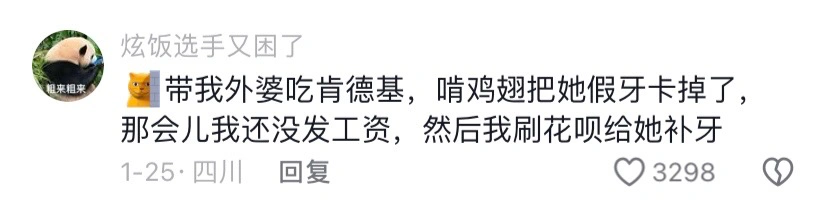 带我外婆吃肯德基,啃鸡翅把她假牙卡掉了9那会儿我还没发工资,然后我刷花呗给她补牙