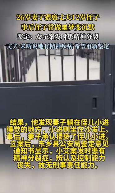 “太炸裂!”甘肃,男子发现妻子衣衫不整地躺在12岁侄子的床上,而且妻子坦言自己猥亵了侄子!男子不信,以为妻子跟自己闹离婚说气话气自己,于是问侄子有没有这回事情,没想到侄子红着脸承认了,这下男子感觉整个世界都崩塌了! 张先生(化名)和他的妻子小孙(化名),两人结婚七年,养着三个孩子,日子不算富裕,但也平稳踏实,街坊邻里都觉得这是户本本分分的人家,张先生在外挣钱养家,小孙在家操持家务带孩子,典型的男主外女主内模式。 谁也没想到,今年七月的一个深夜,平静被彻底打碎,那天晚上,张先生像往常一样哄完三个孩子睡觉,转身回卧室准备休息,却发现本该在床上的妻子不见了,家里就那么大,他循着微弱的灯光找过去,最后停在了侄子的房门口。 推开门的瞬间,张先生感觉血液都凝固了,12岁的侄子床上,妻子衣衫不整地躺着,他当场就傻了,脑子里一片空白,好半天才反应过来,情绪瞬间冲到了顶点。 面对丈夫的追问,小孙情绪低落到了极点,最后吞吞吐吐承认,自己对侄子有过不当行为,可张先生怎么也不敢信,他记得妻子最近一段时间情绪一直不太对劲,还好几次跟自己提过离婚,他宁愿相信,这番话是妻子的气话,是故意用来刺激他的。 为了弄清真相,张先生强压下心里的震惊和愤怒,单独把侄子叫到了一边,12岁的孩子,正是敏感害羞的年纪,面对叔叔的询问,他一直低着头,脸憋得通红,沉默了好久,才轻轻点了点头,更让张先生崩溃的是,侄子说,这种事不是第一次发生了,之前因为害怕,一直不敢说,只能自己忍着。 孩子的话像一把锤子,彻底敲碎了张先生的侥幸,他知道事情闹大了,不敢耽搁,当即报了警,警方介入后,小孙很快被依法刑事拘留,可就在调查过程中,又一个意外出现了,经过专业的精神鉴定,小孙竟然患有精神分裂症,案发的时候,她根本没有能力辨认和控制自己的行为,最终被认定为无刑事责任能力。 这个结果,让本就陷入绝境的张先生雪上加霜,一方面,他对侄子充满了愧疚和自责,觉得是自己没看好家里,才让孩子遭受了这样的伤害,另一方面,他又对妻子的病情感到无比茫然,结婚七年,他从来没发现妻子有严重的精神问题,之前也没有任何诊断记录,更别说治疗了。 后来这事儿被媒体报道后,网上的讨论就没停过,有网友把焦点放在了未成年人保护上,说家庭内部的侵害最隐蔽,也最容易被忽视,必须早点发现、及时制止,才能给孩子足够的保护。 更多的人,还是心疼那个12岁的孩子,这么小的年纪,遭遇了这样的事情,心里得留下多大的阴影。 这事儿也给所有家庭提了个醒,未成年人保护不能有半点马虎,精神健康问题不能忽视,家庭责任更不能推卸,任何一个环节出了问题,都可能酿成无法挽回的后果,希望这样的悲剧,以后再也不要发生了。 信息来源 :南京广播电视台