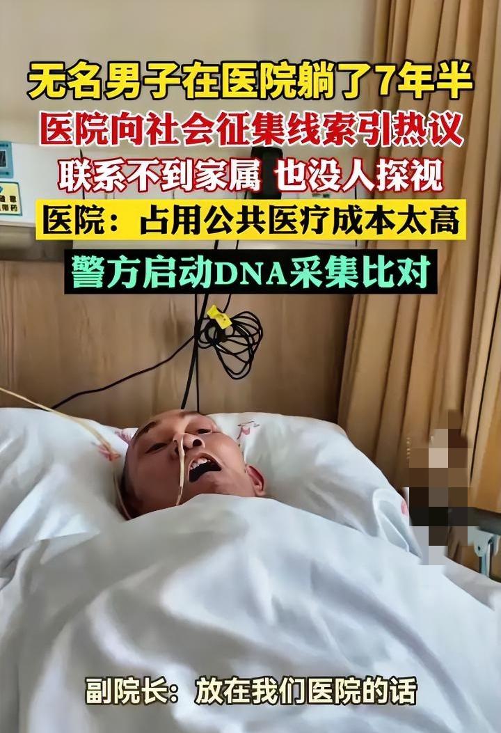 这家医院真行,照顾无名男子7年半,虽说找不到家属,但也没有置之不理。 如今医院实在扛不住了,向社会求助征集家属线索,主要是男子占用医疗成本太高。 这家医院在江苏句容,能将素不相识的人救治照顾7年半,确实不容易,网友们也非常敬佩。 不过这位病人的家属就有点不地道了,是故意躲着怕花钱?还是不知情?目前警方已经启用DNA采集对比,相信很快就会有结果了。