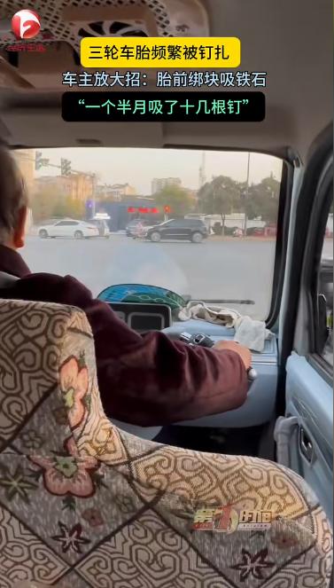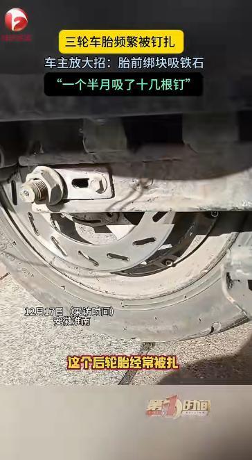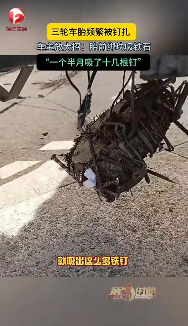 太有头脑了!安徽一男子的三轮车轮胎,经常被钉子扎,为了防止这种事情发生,男子灵机一动,竟然在轮胎前绑了个吸铁石,用来吸附路上的铁钉!效果非常好,也不碍事,又不重,一个半月吸了十几根钉,网友:高手在民间! 王先生(化名)最近因为一个看似简单的小发明,在网络上意外走红,事情的起因并不复杂,却十分贴近生活。 王先生平时出行主要依靠一辆电动三轮车,无论是买菜、拉货,还是短途办事,三轮车几乎成了他的“腿”,然而让他头疼的是,车子轮胎经常被路面上的钉子、铁丝扎破,一次两次还能忍,次数多了,不仅耽误行程,每次补胎还要花钱,时间和精力都被反复消耗。 王先生回忆,最频繁的时候,一个月能补好几次胎,有时刚修好没几天,又被钉子扎漏气,尤其是在一些施工路段或老旧道路,铁钉、碎铁片防不胜防,起初他以为是运气不好,后来发现并非个例,身边不少骑三轮车、电动车的人也有类似遭遇。 多次受挫后,王先生开始琢磨有没有办法提前“拦截”这些钉子,灵机一动他想着要是能将这些钉子吸走那不是就不会发生这样的事情了,抱着试试看的想法,他买来一块吸力较强的吸铁石,用简单的支架固定在前轮下方,距离地面很近,但又不会刮到路面。 刚开始安装时,王先生也有顾虑,担心影响骑行、增加重量,甚至可能存在安全隐患,但实际使用后,他发现吸铁石并不重,对行驶几乎没有影响,转弯、颠簸时也很稳定,最关键的是,效果出乎意料地好。 为了验证效果,王先生特意留意了轮胎状况,相比之前频繁漏气,现在轮胎基本保持完好,骑行时也更安心,他把这个“小妙招”拍成视频发到网上,本意只是分享经验,没想到很快引来大量关注。 网友们在评论区议论纷纷,有人夸他“生活智慧满分”,用最简单的办法解决了最实际的问题,也有人表示自己早就被扎胎折磨多年,看完后立刻准备照做。 当然,也有理性的声音指出,这种方法适合低速行驶的三轮车、电动车,对高速车辆并不适用,但在王先生的使用场景下,这个办法确实起到了明显作用。 这件小事之所以引发共鸣,或许正因为它来源于真实生活,没有复杂原理,也不需要昂贵成本,只是一个普通人面对反复困扰时,做出的务实选择,很多网友表示,与其抱怨路况,不如像王先生一样,用一点巧思,为生活减轻一点负担。 信息来源:AHTV第一时间
