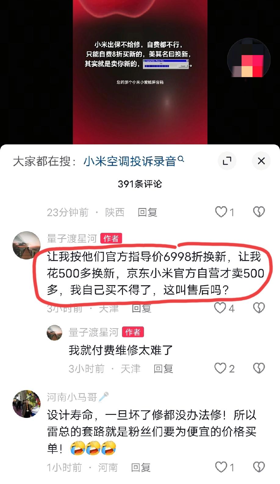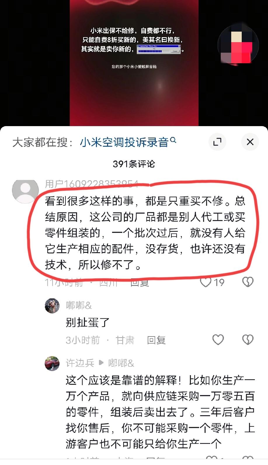 天津。消费者五年前买了一台小米小爱触屏音箱,近段时间坏了,他想修一下,得到的回复是“出保了,不给修了”。消费者提出自己出钱让他们来修,客服回复“真的修不了,没物料了”,他们还提出一个方案,让消费者按他们的官方指导价699的八折以旧换新…… 这位消费者吐槽道:让我花500多以旧换新,京东小米官方自营也才卖500多,当我傻子呢? 网友锐评:不得不说,小米真的是好算盘啊,这个方案既处理了一个售后,又给自己多了一个销量![捂脸][捂脸][捂脸]