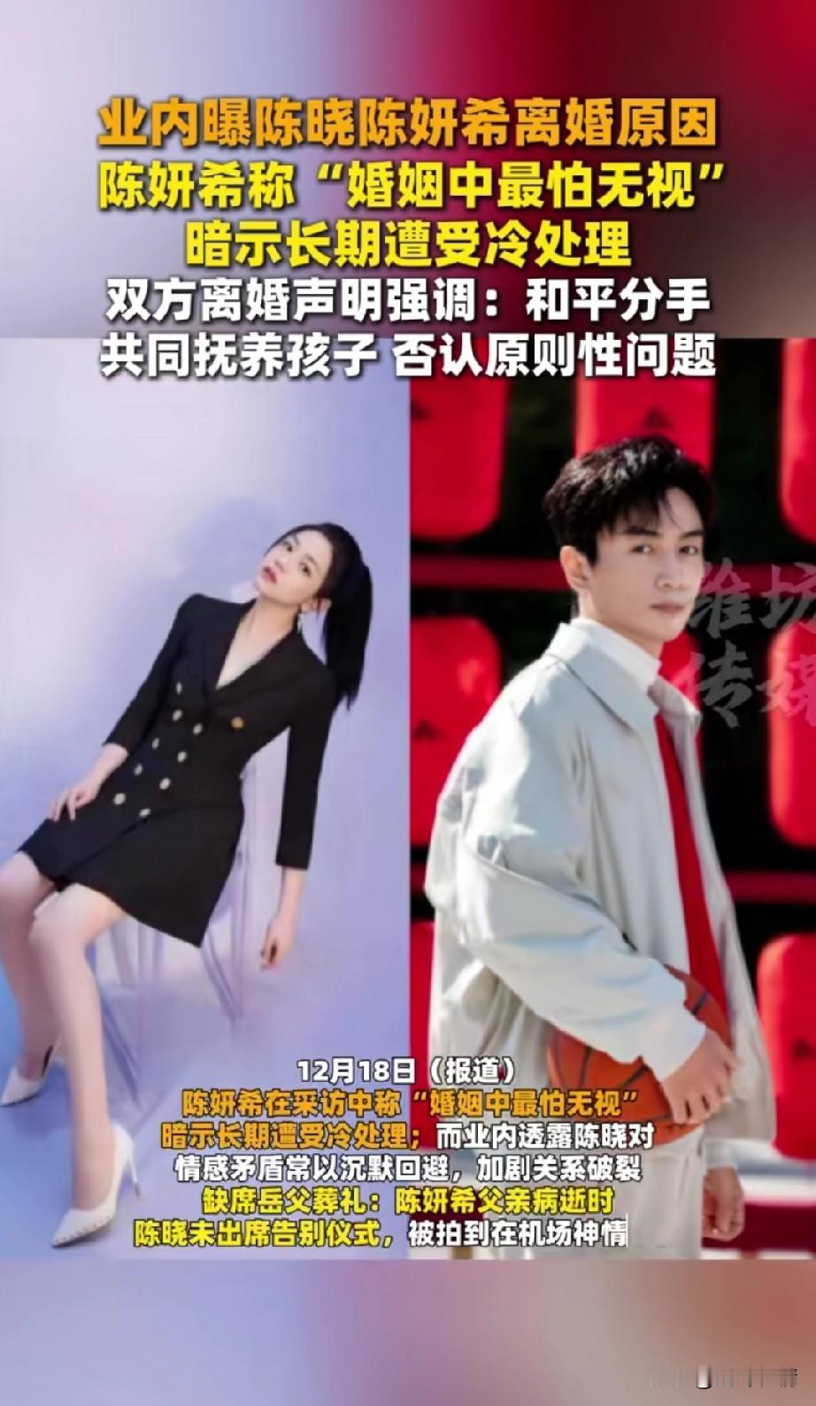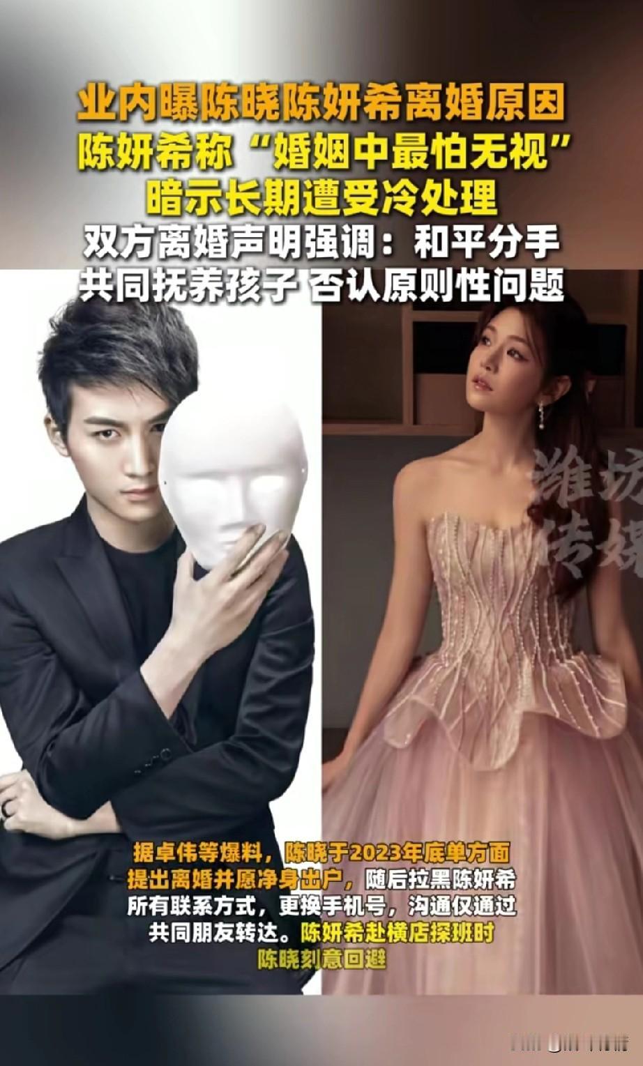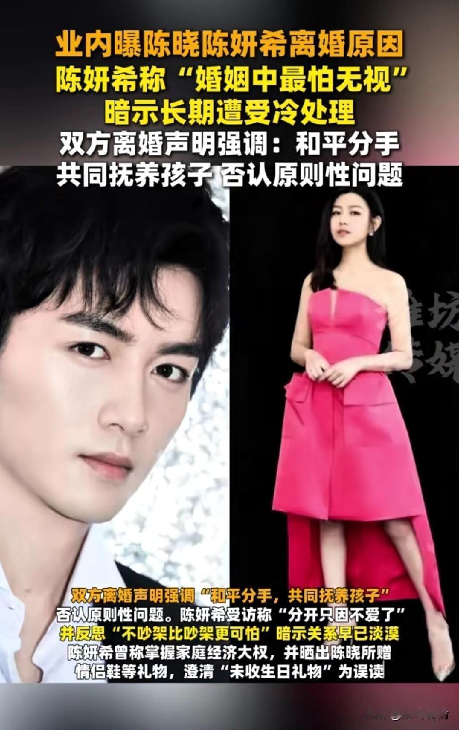 这就是陈晓和陈妍希离婚的真相, 陈妍希称婚姻中最怕被无视, 暗示自己经常被冷处理? 业内人士称陈晓对于婚姻矛盾经常以沉默应对,这加剧了二人婚姻关系的破裂,并且陈妍希父亲去世的时候, 陈晓并未出席葬礼, 被拍到在机场露面, 并且当时离婚时陈晓表示愿意净身出户,可见是有多么的不想和陈妍希过了,之后更是将陈妍希拉黑, 更换了自己的联系方式, 相当于直接和陈妍希断开联系, 中间有事都是通过朋友转达的, 后来陈妍希去横店探班, 陈晓更是刻意躲开了, 两人离婚时表示会共同抚养孩子, 陈妍希虽然掌握经济大权, 但是双方都不爱了, 金钱对于他们来说无关紧要, 让一个男人自愿净身出户, 可以看出是真的不喜欢了, 大家对于两者和平分开怎么看? 扒一扒娱乐圈 陈晓 陈妍希 陈晓合影 陈妍希情史 陈妍希自拍 假如陈晓再婚