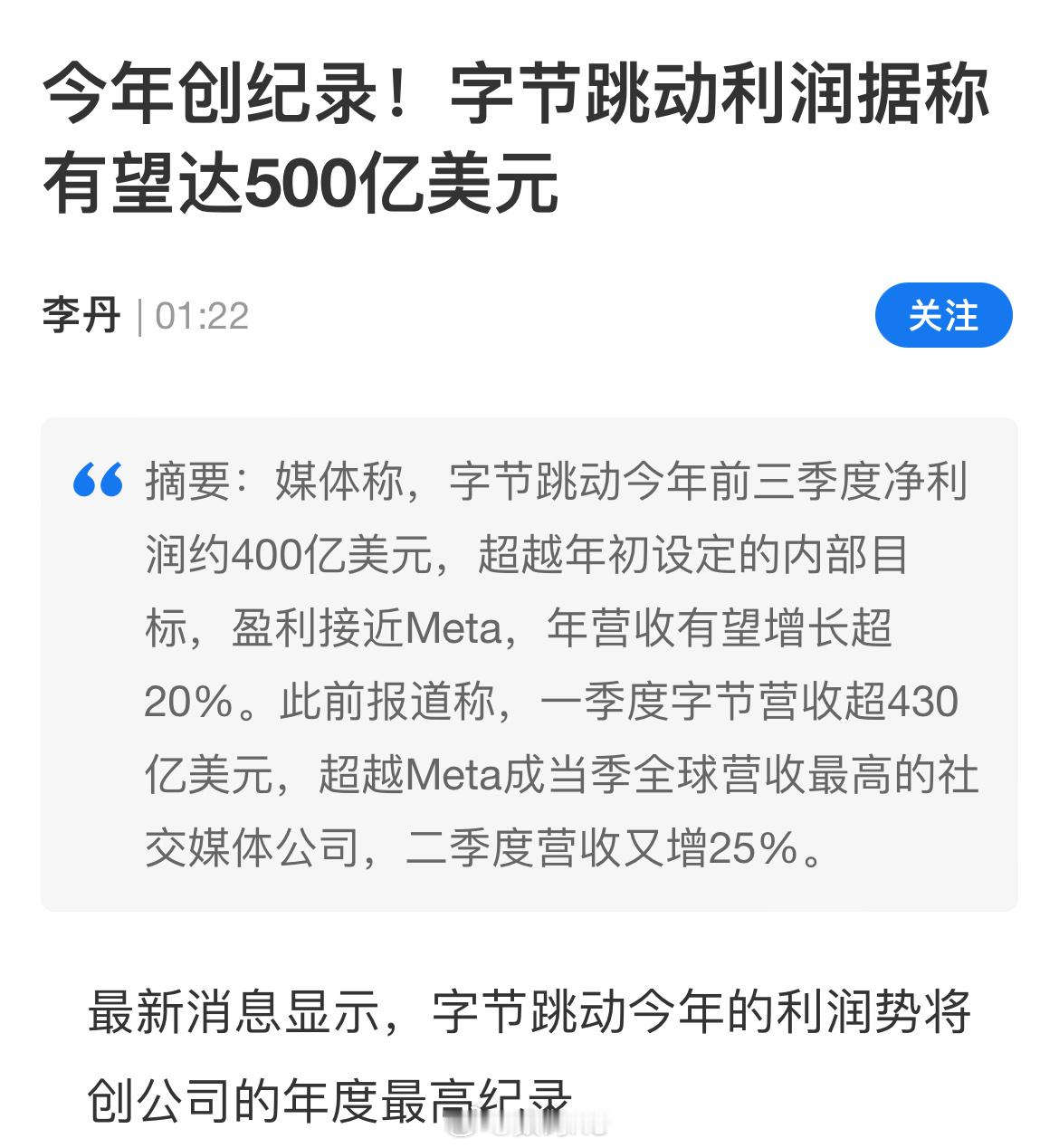 字节今年净利润有望达500亿美元字节跳动利润据称有望达500亿美元,这个利润太恐怖了,中国互联网第一公司也不为过,关键还能增长