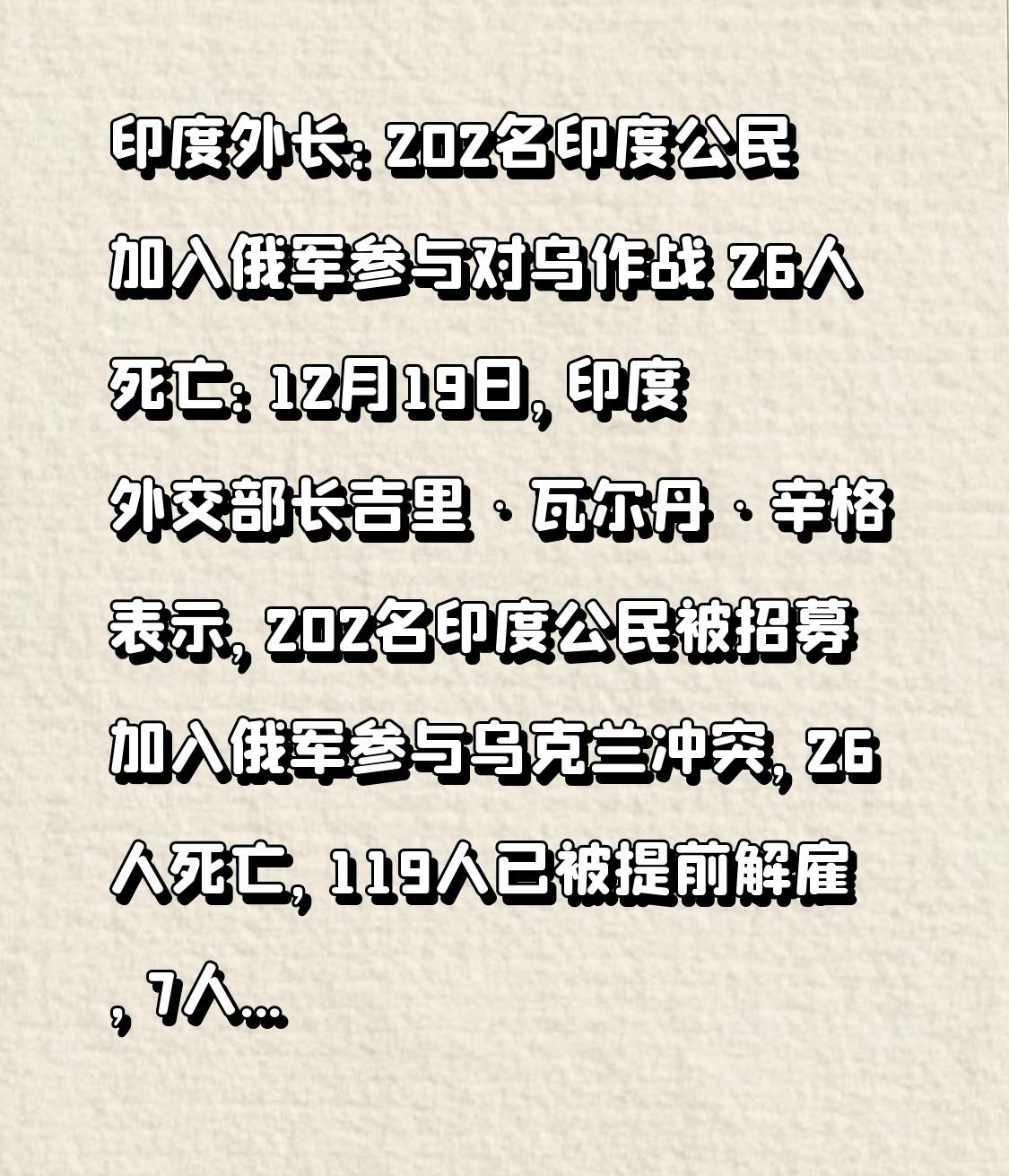 印度外长:202名印度公民加入俄军参与对乌作战 26人死亡:12月19日,印度外交部长吉里·瓦尔丹·辛格表示,202名印度公民被招募加入俄军参与乌克兰冲突,26人死亡,119人已被提前解雇,7人下落不明,当局正努力让另外50人退出,已协助运回10名遇难者遗体。