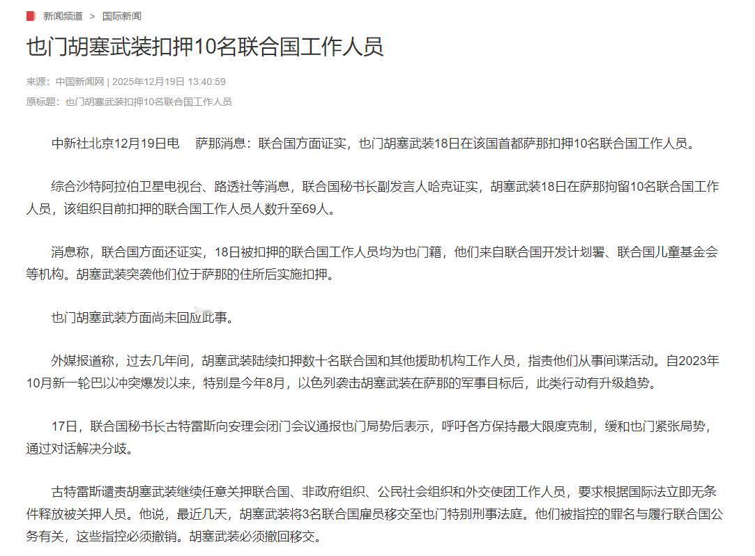 胡塞武装再次硬钢联合国! 也门胡塞武装扣了10名联合国工作人员的事儿,联合国已经证实,18号那天,胡塞武装在也门首都萨那直接闯了这些人的家,把10个人强行扣了,现在被他们扣着的联合国工作人员总共都69个了。 这些被抓的都是也门本地人,在联合国的援助机构干活,本来是帮自己国家老百姓渡难关的,结果遭了这事儿。 到现在,胡塞武装也没出来说句话。这事儿不是凭空发生的,背后是也门打了十几年的内战,还牵扯着人道主义援助和地区冲突的矛盾。 有人觉得这就是武装组织的极端做法,但结合也门打了十几年仗的背景来看,这事儿没那么简单,更像是冲突升级的连锁反应。 其实胡塞武装之前就跟联合国闹过摩擦,扣过不少援助人员,尤其是2023年巴以冲突爆发后,再加上今年8月以色列炸死了他们几个高官,这种扣人的事儿就更多了。 之前还出过联合国工作人员在关押期间死掉的事儿,挺让人揪心的。胡塞武装说扣的是帮美国、以色列干活的间谍,但联合国根本不承认,两边说不到一块儿,核心还是地区里各方势力在较劲。 要说清楚这事儿的影响,得先知道也门老百姓有多难。这个国家打了十几年仗,快480万人没家可归,近2000万人等着别人救急,一半人得靠国际援助才能活下去。 尤其是小孩,每两个五岁以下的就有一个营养不良,50多万孩子还面临致命的饥饿,就算活下来也可能落下病根。 而联合国工作人员就是来救急的:给饥民送吃的、给孩子治病建医院、修水电道路,这些活儿直接关系到几百万人的生死。 按国际规矩,联合国工作人员受保护,不能随便扣,所以联合国秘书长才强烈谴责,要求马上放人。但站在也门内战的角度看,胡塞武装这么做,更像是自己实力弱,想靠扣人施压。 他们把这些工作人员当筹码,想让国际社会重视他们的诉求,对抗敌对势力,甚至把几个人交给所谓的法庭定罪,就是想把援助人员和冲突绑在一起增加话语权,可这种做法确实突破了做人的底线。 这种扣人的做法,最后遭罪的还是也门老百姓。工作人员不安全,联合国只能少干活甚至暂停援助,之前就因为扣人停过一个省的援助,当地老百姓立马就没饭吃、没医看了。 现在被扣的人越来越多,粮食、医疗援助都送不进去,1700万人等着吃饭,好多地方都断供了。 除此之外,这事儿还让也门的和平更难实现了。国际社会施压,胡塞武装反而更对抗,本来就谈不拢的和平谈判,现在更没信任基础了。 更危险的是,要是别的武装也学着这么干,援助通道就彻底断了,也门的危机只会更严重。 说到底,胡塞武装扣人,既反映了他们在博弈中的无奈,也说明国际社会调解也门问题没找到好办法。不管有啥诉求,都不能拿救人性命的工作人员开刀。 现在69个家庭在煎熬,几百万老百姓等着援助,光谴责没用,得搭建对话平台,让各方坐下来谈,既重视胡塞武装的合理诉求,也得让他们放人。只有也门不打仗了,老百姓才能过上安稳日子,被扣押的人才能早日回家。