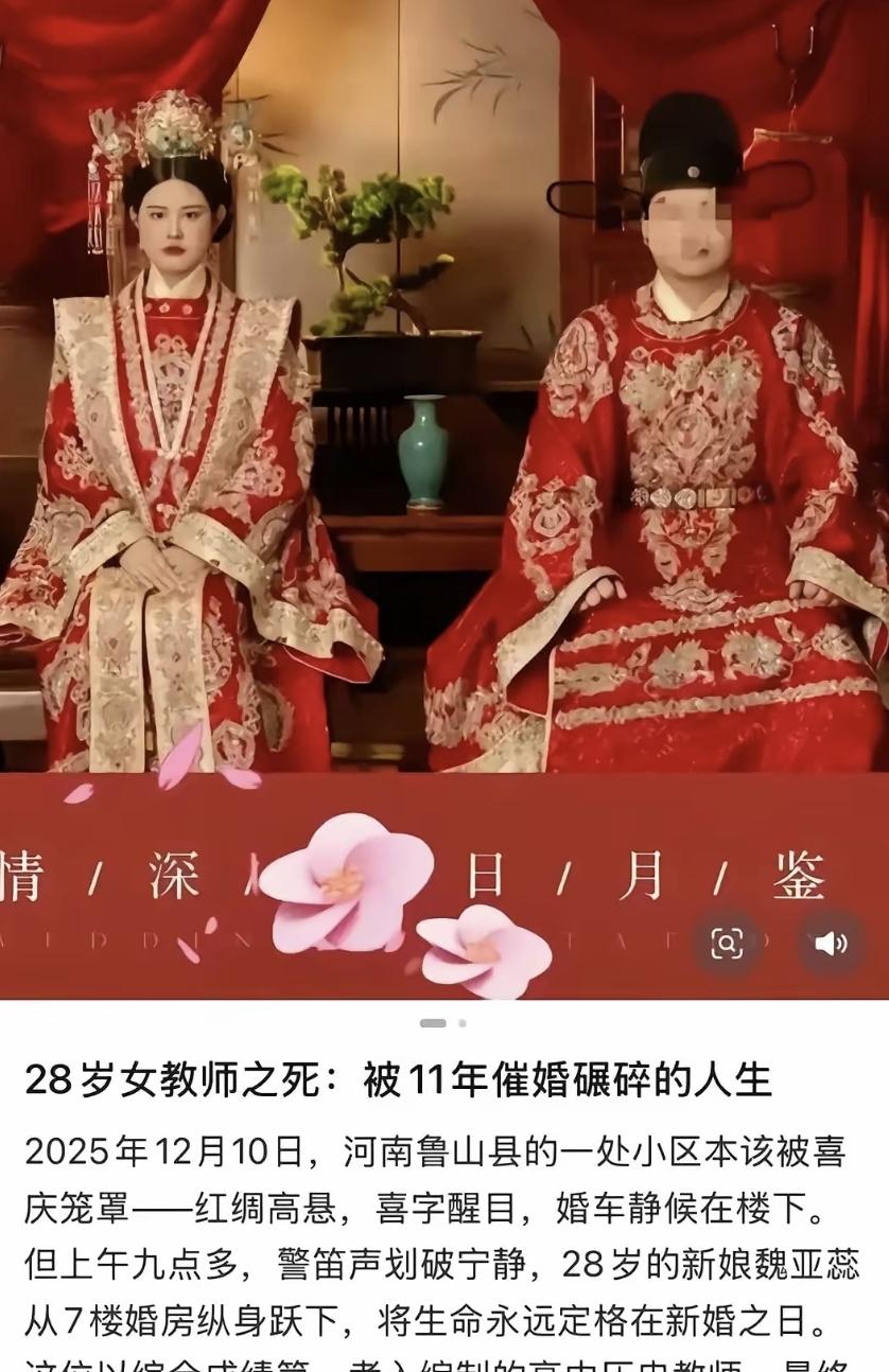女教师魏某在婚礼当天从高楼跳下,遗体在院子里躺了一天。她妈妈说她已经要嫁人了,该婆家管,婆家说没领证不算夫妻。魏某在重点高中当老师,工资卡被妈妈管了七年,每月只给500块生活费,攒了三年才3万。她偷偷取消婚礼说要退礼金,结果被父母骂到发抖。妈妈说彩礼钱早给孩子弟弟存着娶媳妇了,弟弟以后怎么办。魏某在楼上反锁门,在朋友圈让朋友把骨灰撒到有风有太阳的地方,最后跳了下去。