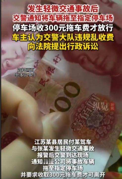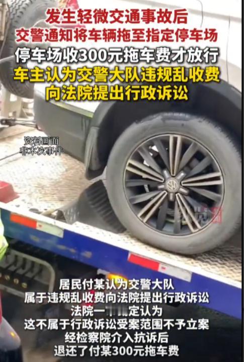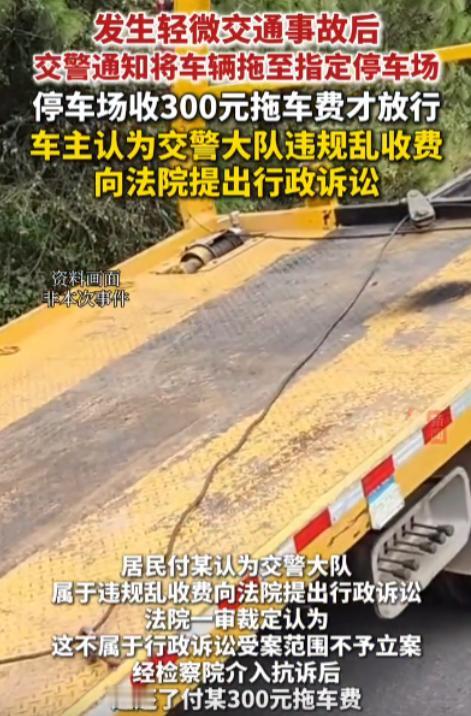 江苏宿迁,一男子开车与另一辆车发生轻微刮蹭,车损也就600元,可交警却说要把车拖到指定停车场,然后通知救援公司来拖车。事后男子提车时被收取了300元拖车费。男子认为停车和交警队有串通乱收费,于是将交警队告上法院,要求认定拖车行为违法,并退还300元,可一审法院却以不是行政案件为由不予立案。直到检察院介入此事后,才有了不一样的结果。 江苏宿迁的天空阴沉沉的,空气里带着一丝闷热。付先生像往常一样,开着自己的私家车出门办事。 他怎么也没想到,这一天会因为一次几乎可以忽略不计的小刮蹭,彻底改变他对“执法”和“维权”这两个词的认知。 车子行驶到市区一条并不算繁忙的道路时,前方一辆车突然减速。付先生反应及时踩下刹车,但还是与对方车辆发生了轻微接触。 “咯噔”一声,两辆车停了下来。下车查看后,双方都松了一口气——没有人受伤,车子只是留下几道浅浅的划痕。对方车主看了看,说修一下最多几百块钱。 按理说,这样的事故拍照、报警、认责,流程很快。交警赶到后,现场勘查、拍照、询问,确认这是一起典型的轻微交通事故,责任也并不复杂。付先生心想,事情很快就能结束。 可就在他准备上车离开时,一名交警却拦住了他,说车辆需要被拖走,送到指定停车场。付先生一愣,下意识问了一句:“车还能开,事故也不严重,为什么要拖?” 交警语气平淡,却不容商量:“这是规定,必须拖走,等处理完再来提车。” “那我自己叫拖车行不行?”付先生又问。 “不行,只能用指定的救援公司。”对方回答得干脆利落。 付先生心里隐约有些不安。他注意到,交警并没有出示任何书面决定,也没有开具扣押车辆的凭证,只是简单口头通知了一句“到时候来提车”。 可面对执法人员,他还是选择了配合。很快,一辆救援拖车赶到,将他的车拖走了。 几天后,事故处理完毕。维修评估结果出来,车损只有600元。付先生松了口气,觉得这事总算翻篇了。 他来到指定停车场提车,却被工作人员拦下,指着收费单说:“拖车费300元,交了才能走。” 付先生当场愣住了。他反复确认:“300元?我又没要求拖车,是交警让拖的。” 对方态度冷淡:“我们只负责收费,不交钱车不能开走。” 那一刻,付先生心里涌起一股说不出的憋屈。车损600元,拖车费却要300元,这几乎占了一半。 他越想越不对劲,隐约觉得这里面有问题:交警指定拖车、指定停车场,费用却由当事人承担,这合理吗? 为了先把车开走,他还是交了钱。但这300元成了他心里的一根刺。回家后,他越想越不甘心,开始查资料、翻法律条文。 他发现,只有在特定情形下,交警才可以依法扣押或拖移车辆,而且必须出具相应的法律文书。 可他当时,什么都没见到。 几经犹豫后,付先生决定起诉交警队。他的诉求很简单:确认拖车行为违法,并退还那300元。可现实再次给了他一记重击。 一审法院在审查后,直接裁定不予立案,理由是“不属于行政案件”,认为这是拖车公司收费引发的民事纠纷。 那一刻,付先生坐在法院走廊的长椅上,心里一片冰凉。他不是为了300元,而是觉得普通人面对这样的情况,似乎连说理的门都进不去。 事情的转机,出现在检察院的介入。当地检察机关在了解案情后,发现问题并不简单。 拖车行为是否属于行政强制措施?交警是否履行了法定程序?这些问题,显然属于行政行为合法性的审查范围。 检察院依法向法院提出意见,认为该案应当作为行政诉讼受理。在检察机关的监督下,法院重新审查案件,最终决定立案。 庭审中,付先生第一次有机会完整讲述整个过程。从事故现场的困惑,到提车时的愤怒,再到被拒之门外的无奈,他说得并不激烈,却句句真实。 交警部门则未能提供完整的法律依据,也无法说明为何在无紧急情形下强制拖车,更无法出示任何当时的扣押凭证。 法庭最终作出判决:交警队在没有合理法律依据、且未履行法定程序的情况下,将付先生车辆拖至指定停车场,属于违法行政行为。由此产生的拖车费用,应当返还。救援公司须退还300元。