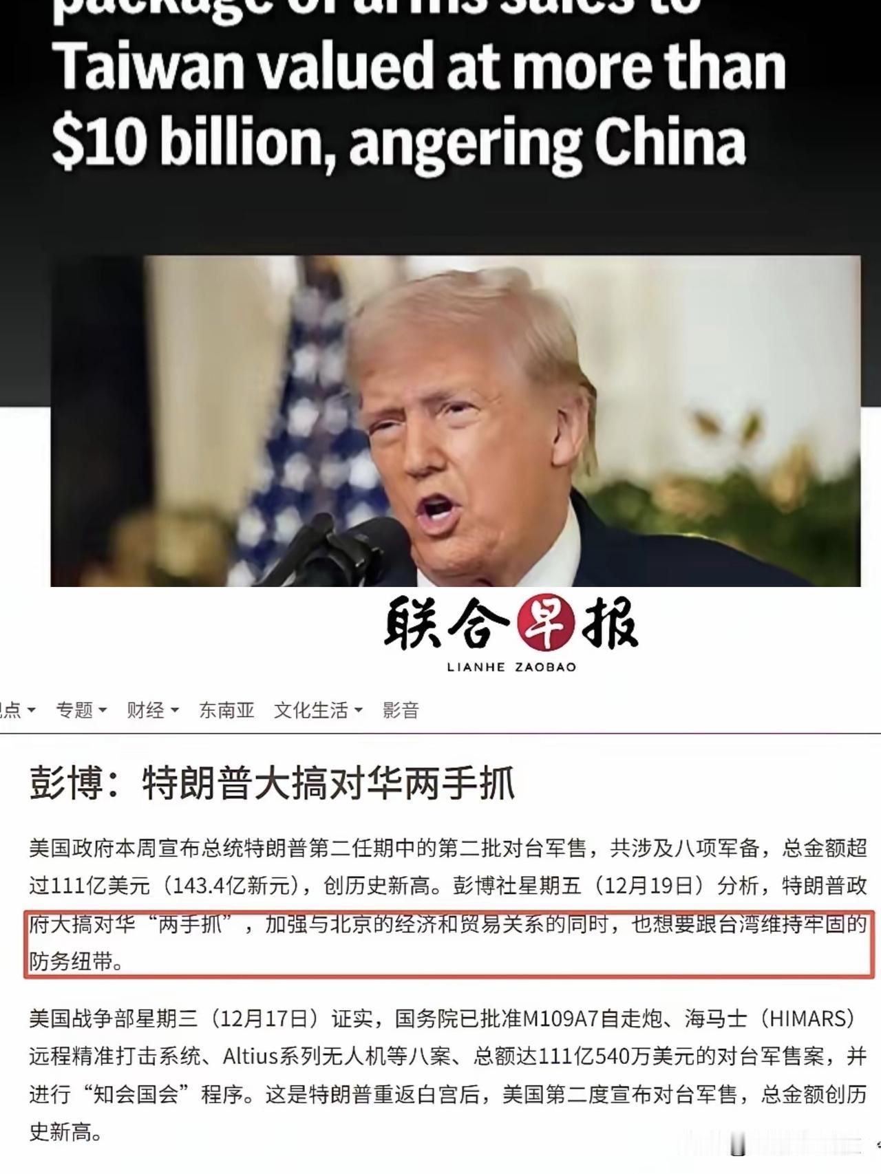 【国防部:美方一再食言背信,纵容支持“台独”,必将引火烧身】!美国想“两头吃”不会得逞,必将付出代价! 111 亿美元 ,美国单方面宣布对台军售,强塞军事武装给台湾 武装台湾,破坏一个中国的原则 破坏了中美“三个联合公报”,特朗普所言:理解与尊重台湾作为中国核心利益关切与重视。美国一再食言! 美国国防部单方面向台湾出售武器,其武器属性特点: 1:除了防御性武器之外,也包括进型武器 如海马斯远程打击 2:以“不对称作战”武器为代表的 反装甲型自杀式无人机 3:以“反登岛”武器为代表的,军售案中提到的“台湾战术网络(TTN)暨部队觉知应用套件(TAK)” 美国不断加码对台军售,足以说明了美国不再是嘴巴讲的遵守一个中国原则 中美互相支持 中美关系稳定而牢固,而是实实在在的破坏中美关系,不管美国出自于什么原因向台出售武器,中国必定强烈反对 并反制美国! 从美国不断向台湾军售来看,美国除了在半导体科技方面要掏空台湾,在对台军售方面 也在掏空台湾,这一切表明美国“掏空台湾”之后 拍拍屁股走人,让台湾成为一个空壳,留给中国大陆与台湾进行“火拼”而美国隔岸观火,美国享受台湾相送的利益,让中国人打中国人 。这也许就是当下美国的真实面目! 美国很清楚 在西太洋海域内,美国没有获胜的可能,美国也不敢与解放军真正的交手,美国军力逐步退出西太地区,走之前掏空台湾经济,留正钢枪给台湾与中国大陆进行火拼,消耗中国大陆的国力。以达到抵消中国大陆的实力。 不过美国政府自以为聪明,自以为这样就可以让两岸中国人打中国人,自以为这样就可以让中国大陆实力哀减,这完全是美国一厢情愿罢了。但中国必定不可能让美国如此得逞,中国的重拳反击,美国政府应该领教过多次了。而对于中国台湾问题,中国大陆没有任何退让空间,美国除了遵守承诺之外没有任何讨价还价的空间。 外界研判,针对这次史上最大的美国对台军售,中国大陆已经发出警告,接下来大概率会出重拳反制。大家拭目以待吧。而美国想搞“两头吃”的图谋就是痴心妄想!