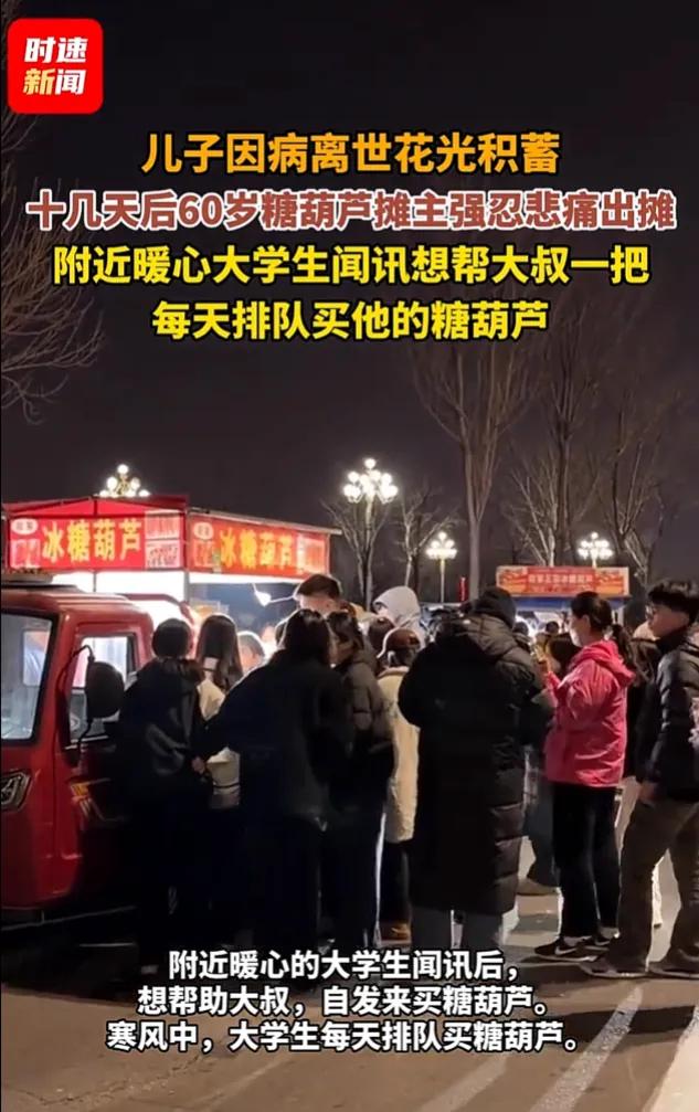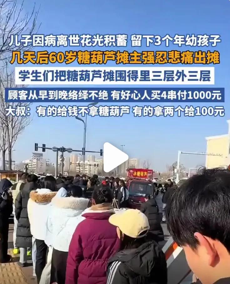 泪奔了!儿子患癌离世留下年幼的孙子孙女,60岁卖糖葫芦大爷强忍悲痛出摊,附近大学生自发排起长队照顾生意。网友:这是大学生该有的样子! 大爷今年60岁,原本该是安享晚年的年纪,却遭遇了人生的重击——儿子患癌离世,为了给儿子治病,家里的积蓄早就花了个精光,还留下三个年幼的孙子孙女要养。悲伤还没散去,大爷就不得不擦干眼泪出摊,毕竟一家人的生计,还有孩子们的吃喝用度,都指着他这串糖葫芦。 大爷的摊位刚支起来,附近高校的学生们知道了他的遭遇后,就自发地赶来捧场。视频里能看到,大爷的小摊被围得里三层外三层,排队的队伍长得看不到头,从早到晚就没断过。有学生买四串糖葫芦直接付了一千块,还有人放下一百块只拿两串,甚至有人塞了钱就走,连糖葫芦都不要。大爷提起这些事时,声音里还带着哽咽,说自己这辈子都没见过这么多好心人。 这些大学生的举动,看着是照顾生意,实则是用最朴实的方式给大爷递上一份温暖。他们没有喊什么响亮的口号,也没有做什么惊天动地的事,只是默默排队、多付钱,用实际行动帮大爷分担生活的重压。这份善意不掺任何杂质,是年轻人最纯粹的共情和善良,也让这个透着寒意的街头,多了股暖烘烘的人情味。 这些大学生用行动证明,善良从来都不是稀缺品,尤其是年轻一代,他们心里装着柔软,也愿意为陌生人伸出援手。这种自发的善意,比任何刻意的慈善作秀都更有力量,也更能打动人心。 大爷的遭遇也让人感慨,普通家庭面对大病时的无奈太真实了。一场癌症,不仅带走了亲人,还掏空了家底,最后只留下老人和孩子面对残破的生活。这背后暴露的,是普通家庭抗风险能力的薄弱,也让人意识到,大病保障体系的完善有多重要。 大学生们的排队,不仅帮大爷解决了眼前的生计问题,更给了他活下去的底气和希望。这份来自陌生人的温暖,会让大爷知道,他不是一个人在扛,也会让孩子们感受到,这个世界上还有很多善意的人。 各位读者你们怎么看?欢迎在评论区讨论。