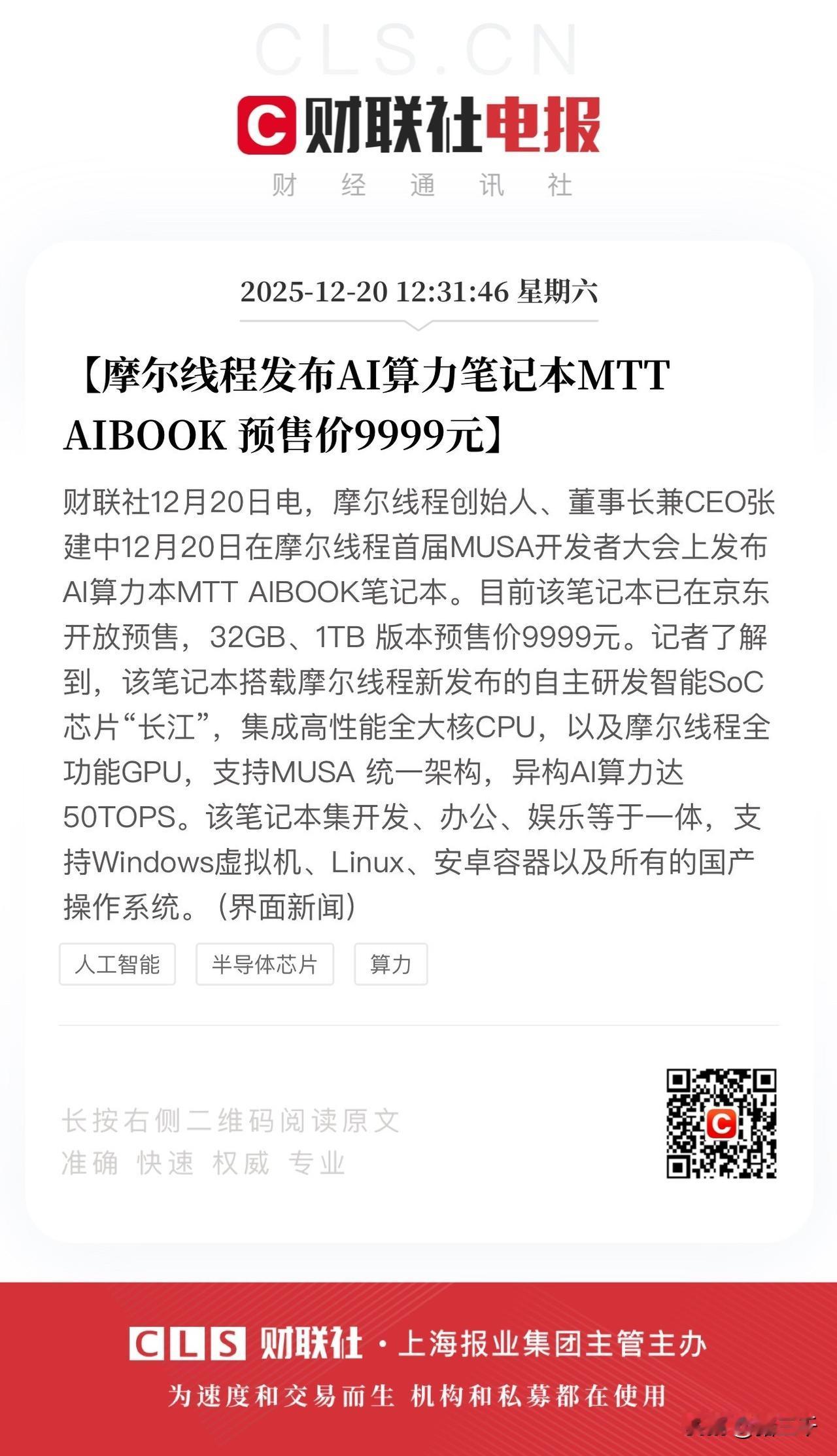 摩尔线程发布Ai算力笔记本MTT AIBOOK 32GB、1TB的配置预售价9999元! 搭载自研SoC芯片和全功能GPU, 支持MUSA架构, 异构算力达50TOPS! 可见摩尔线程意在构建闭环生态, 实现终端消费电子反哺上游研发。 蔚来汽车也曾发布手机, 意在构建蔚来生态闭环。 所以到今天为止分析师才正确解读小米价值, 手机、笔记本、家电、汽车超级终端, 小米现在正解决自研“芯”问题, 这一点上比亚迪专注汽车的优势可能会更突出! 摩尔线程是从上游往下游扩, 这也是英伟达急于干的事, 小米是从下游往上游拓展。 …