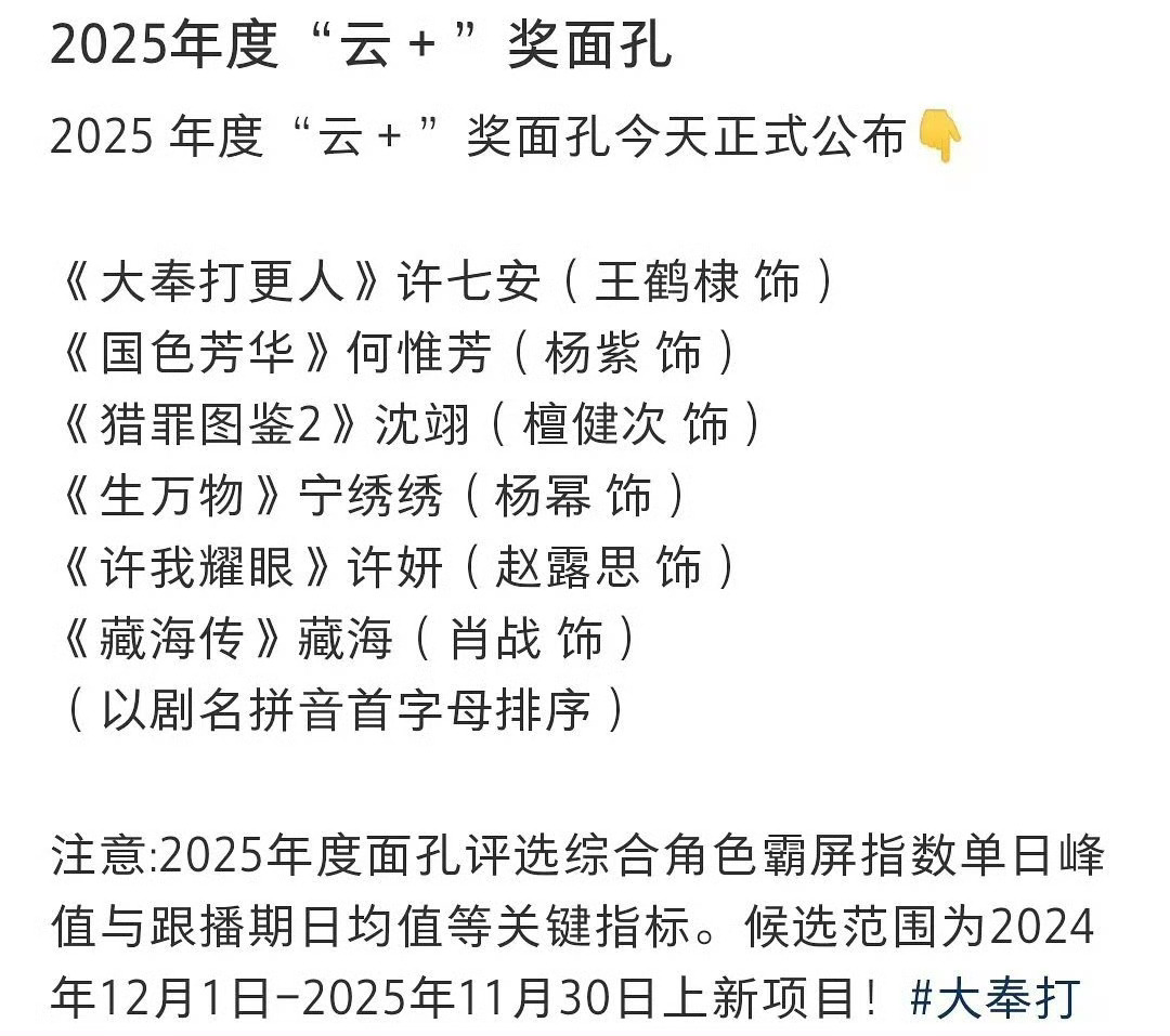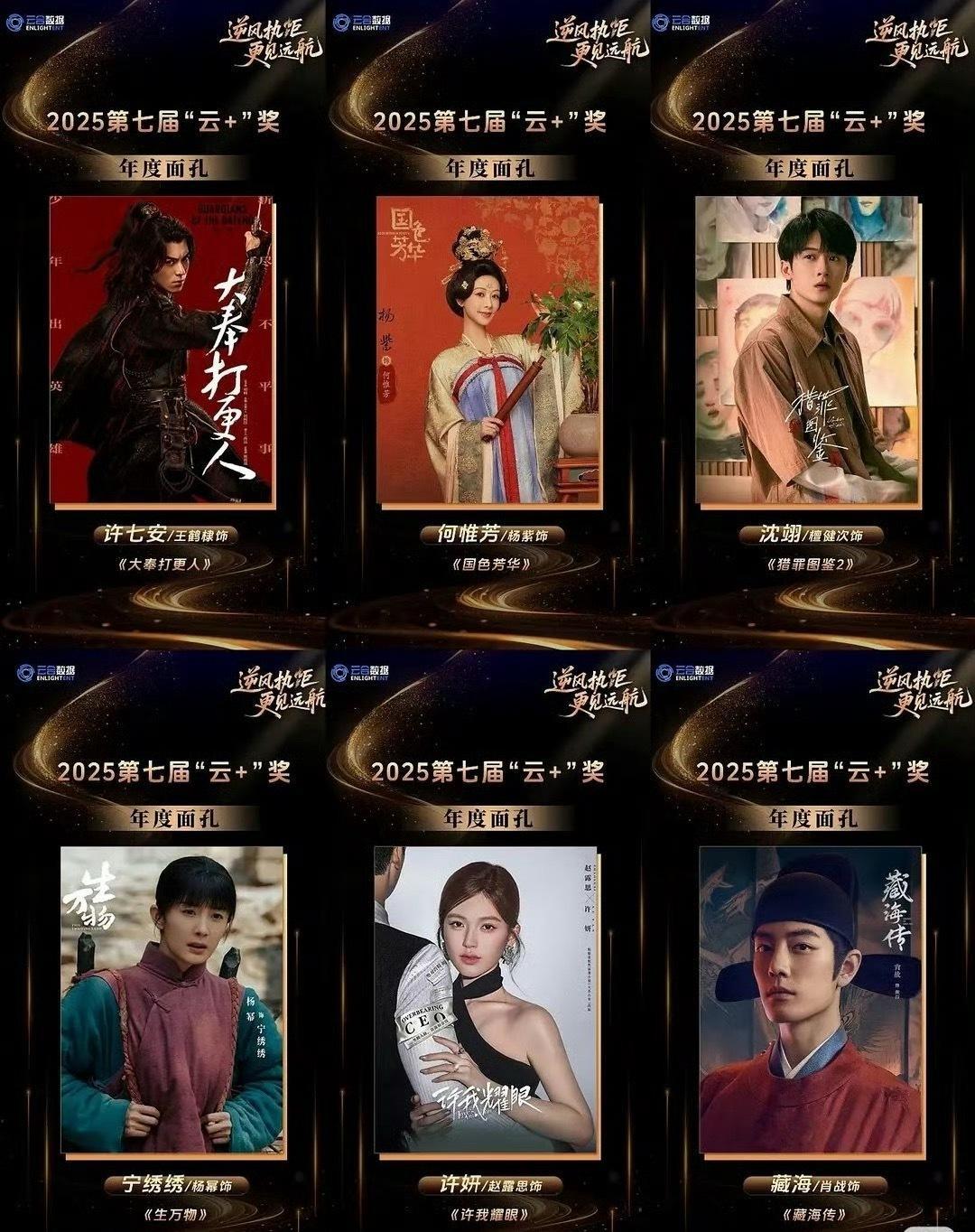 云合认证年度面孔:(以剧名拼音首字母排序)《大奉打更人》许七安(王鹤棣 饰)《国色芳华》何惟芳(杨紫饰)《猎罪图鉴2》沈翊(檀健次 饰)《生万物》宁绣绣(杨幂饰)《许我耀眼》许妍(赵露思饰)《藏海传》藏海(肖战饰)这几部就是25年爆剧,爆款角色了。