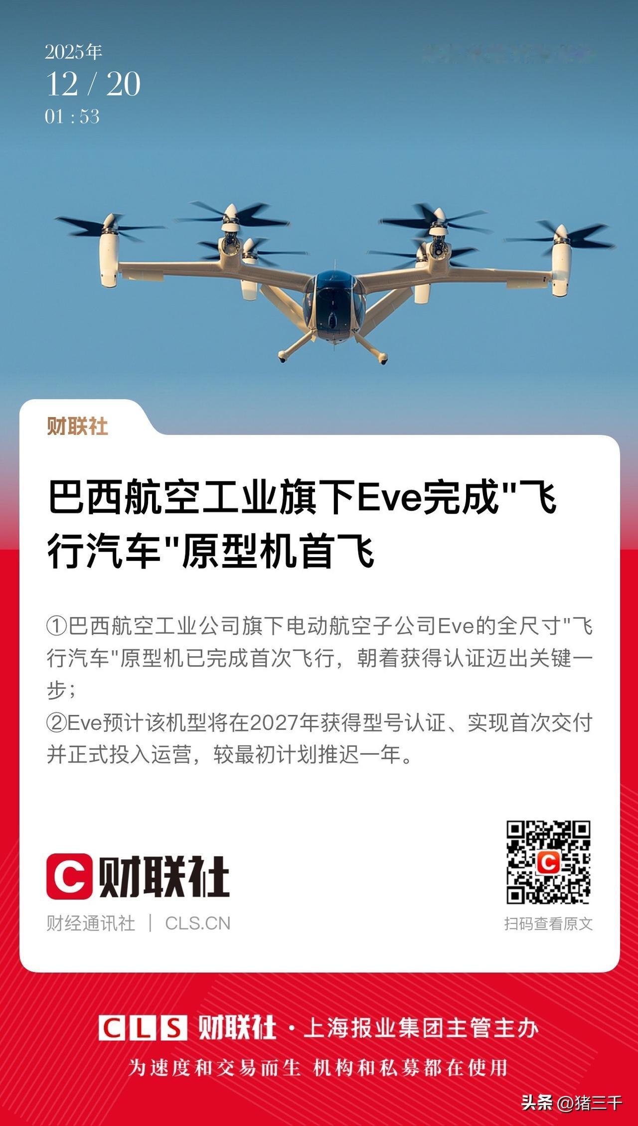 巴西航空工业Eve子公司的飞行汽车, 完成原型机首飞! 飞行汽车这个题材沉寂蛮久了, 上半年深圳完成了从制造到运营的闭环试验, 行业设想最开始的应用场景是景区和高级CBD。 多个县市也做出了具体规划, 有的地方不具备产业基础, 采用交钥匙的项目招标方式。 小鹏汇天、 万丰奥威的钻石飞机、 广汽高域、 吉利飞沃长空、 全球知名品牌亿航智能、 红旗“天辇一号”等。 本质是将小型直升飞机变得更简单灵活和经济适用… 技术底层核心离不开: 发动机、导航、定位、飞控和通讯系统。 在智能化大时代开启的当下, 汽车、船舶、飞机很多底层技术是相通的。 吉利实力不容小觑!
