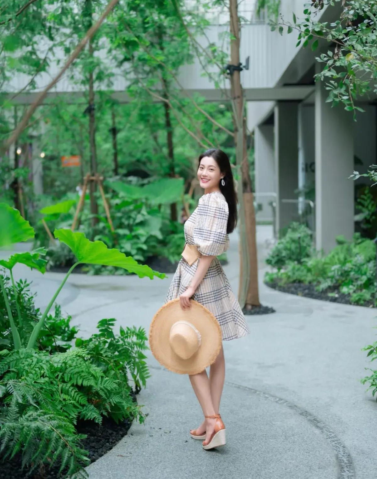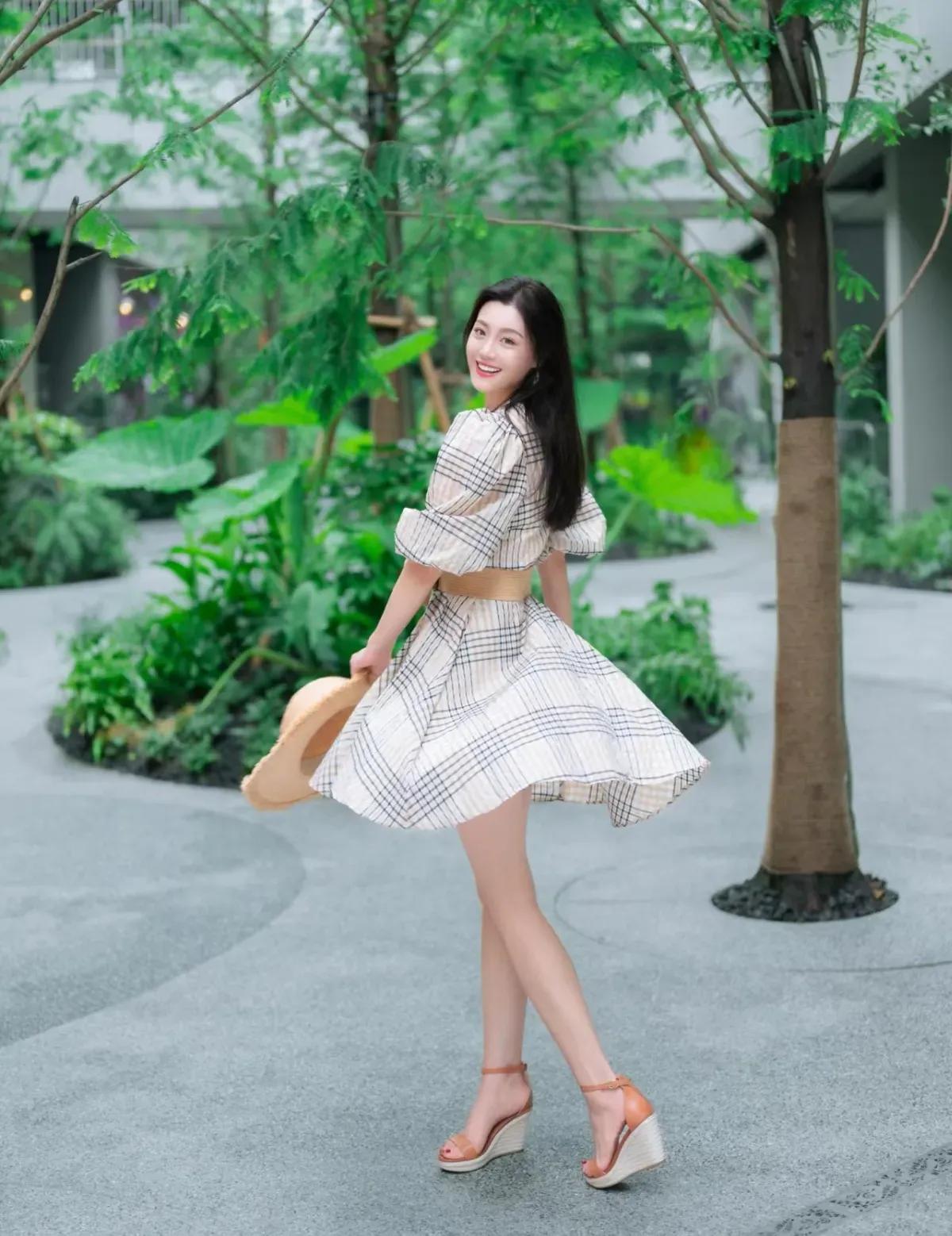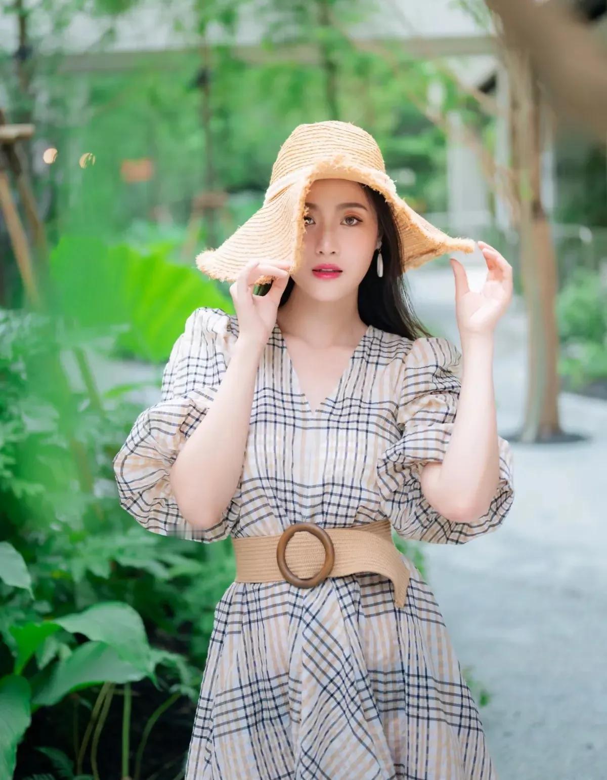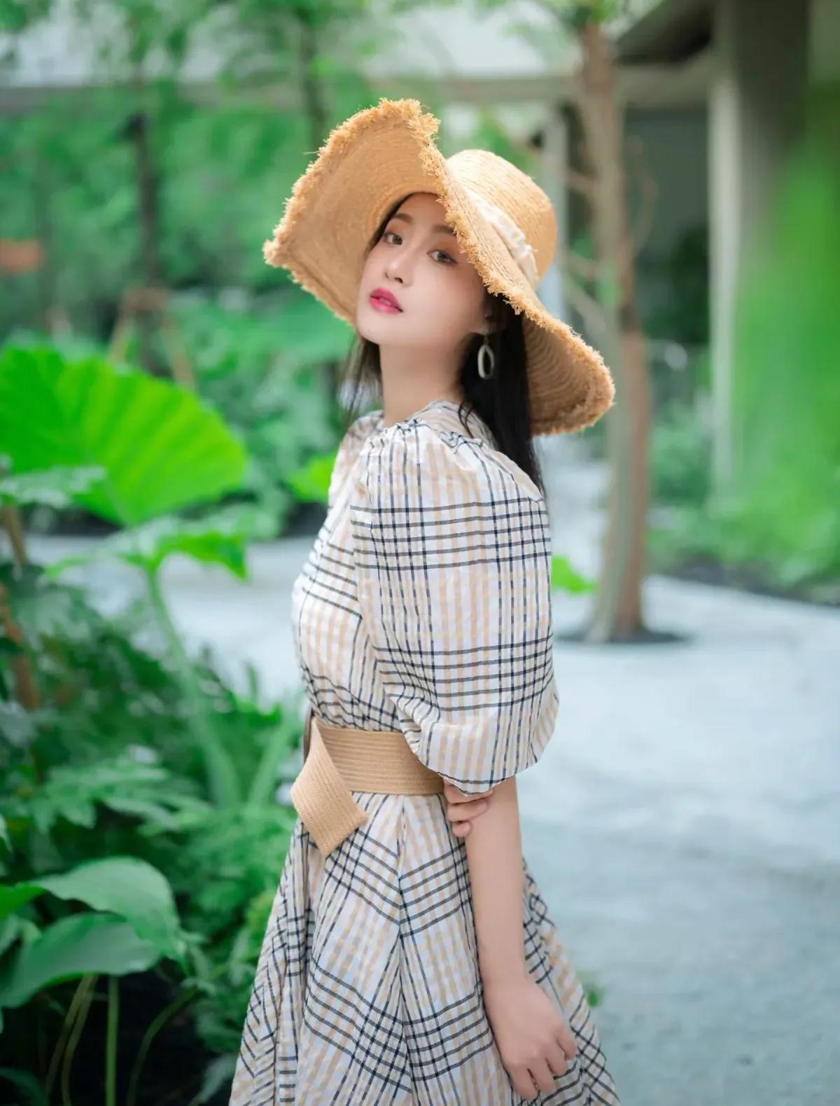 这套穿搭是清新复古的格纹泡泡袖裙装风,温柔甜美又自带法式松弛感。浅棕格纹连衣裙自带复古文艺氛围,泡泡袖+V领设计注入甜美元素,收腰宽腰带既强调了身形,又让宽松裙摆更显利落。 草编帽强化了法式休闲感,与户外环境适配度高;裸色凉鞋简约轻盈,让造型更显清新;简约耳饰点缀,提升了整体的精致度。复古格纹裙穿搭