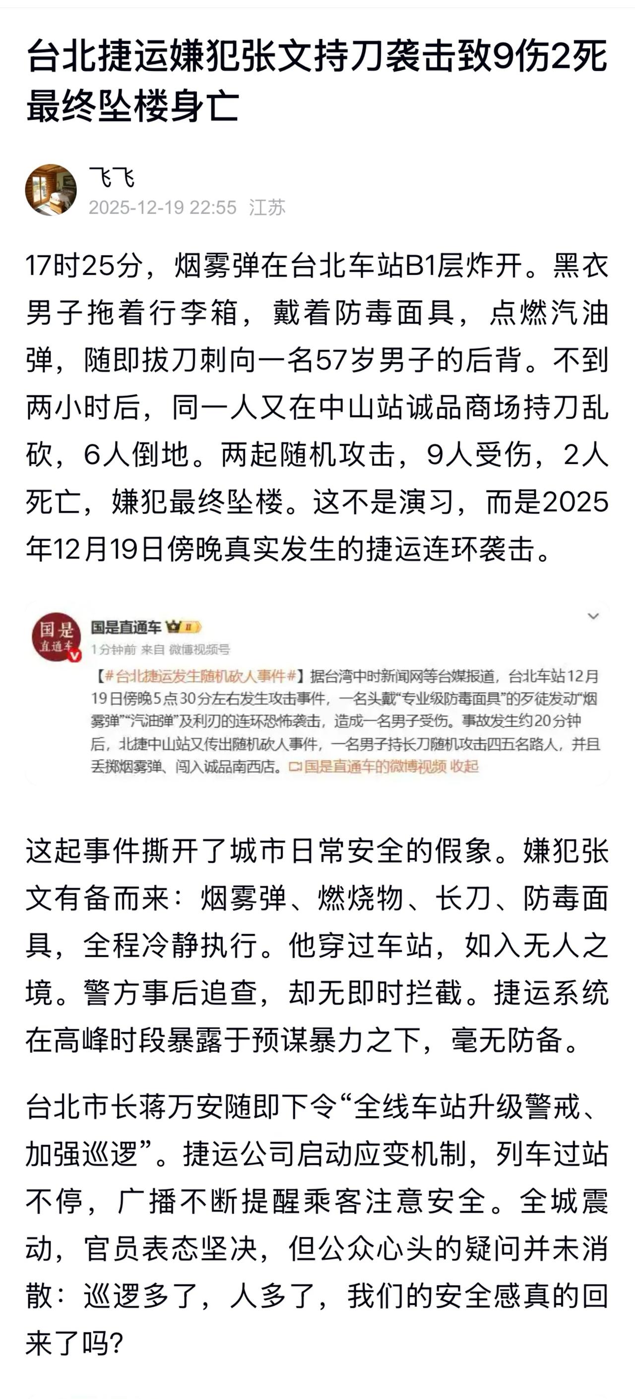 台北全市戒备升级 台北捷运发生袭击案后,台北市长蒋万安于12月20日宣布全市戒备升级。他要求警方即刻起在商圈、人潮聚集地等区域增加警力、装备和巡逻,包括特勤小组,必要时演唱会也会增设安检门。