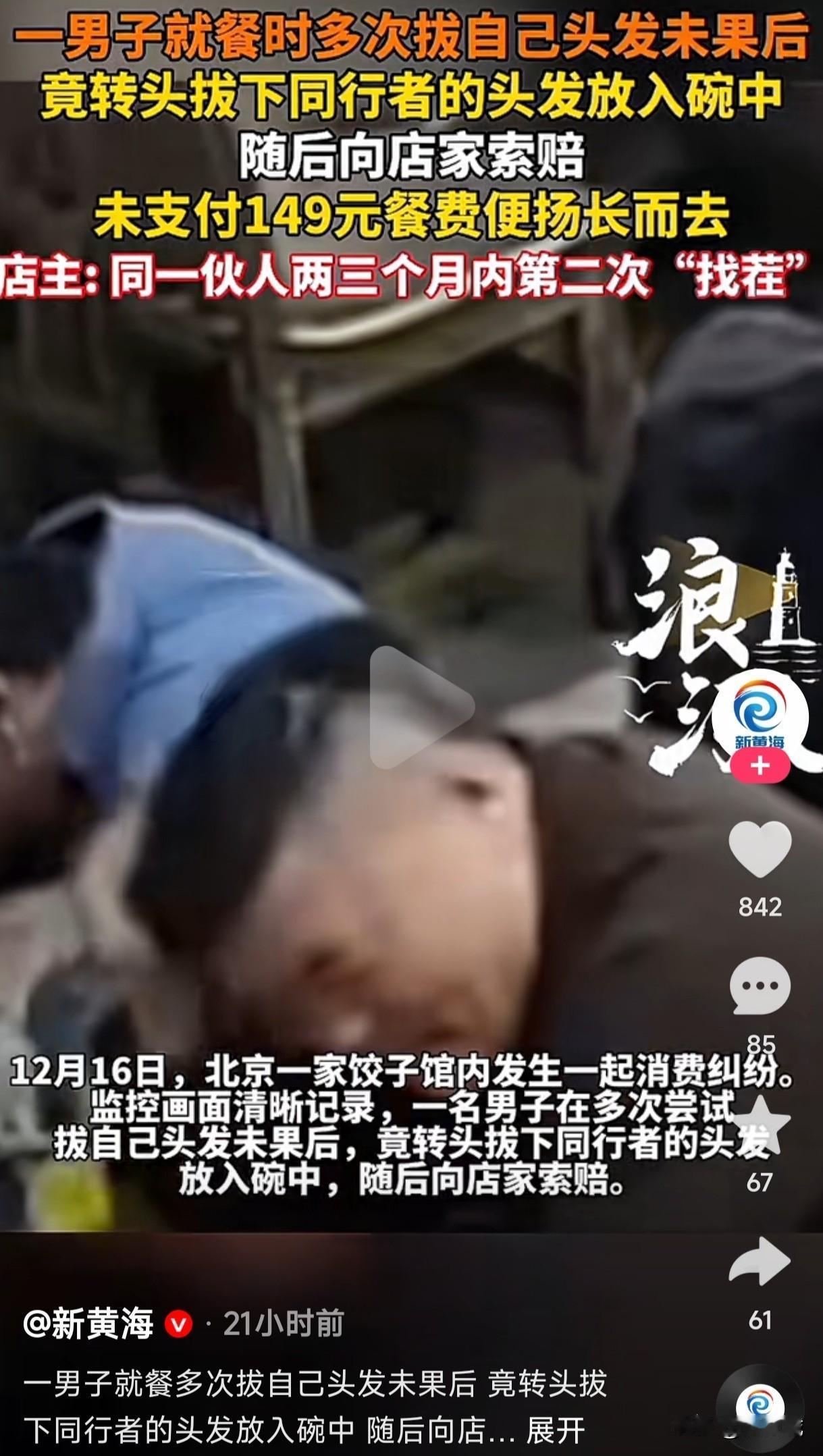 看到这种把自己猪脑袋上的毛拔下来扔到碗里给店家找茬的人,瞬间打死他的心都有。 北京一饺子馆男子多次拔自己头发未果,转头把同伴的头发拔下放入碗中,随后向店家索赔,未支付149元餐费便扬长而去,并且同一伙人在两三个月内是第二次找茬了,这种人到底是天生就缺德还是没钱吃不起饭? 几次三番的到店里找茬吃免费饭,这是店家哪里得罪这帮不是人的玩意了?还是有同行故意雇人给他们店里找事的?谁遇到这种无赖真是倒霉到家了,要不是有监控的存在,就是有多少张嘴都说不清,这种缺德的人难道是吃屎长大的吗?几个人为什么都是这种嘴脸?这种玩意应该给曝光出来,让认识他们的人都看看这种货色的行为,是不是真给祖宗长脸了。
