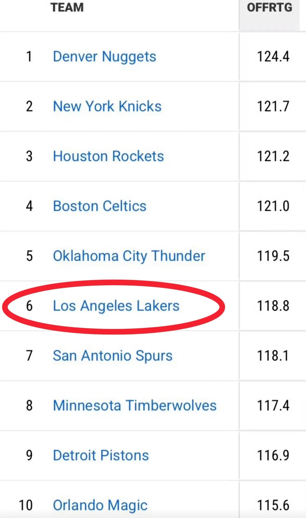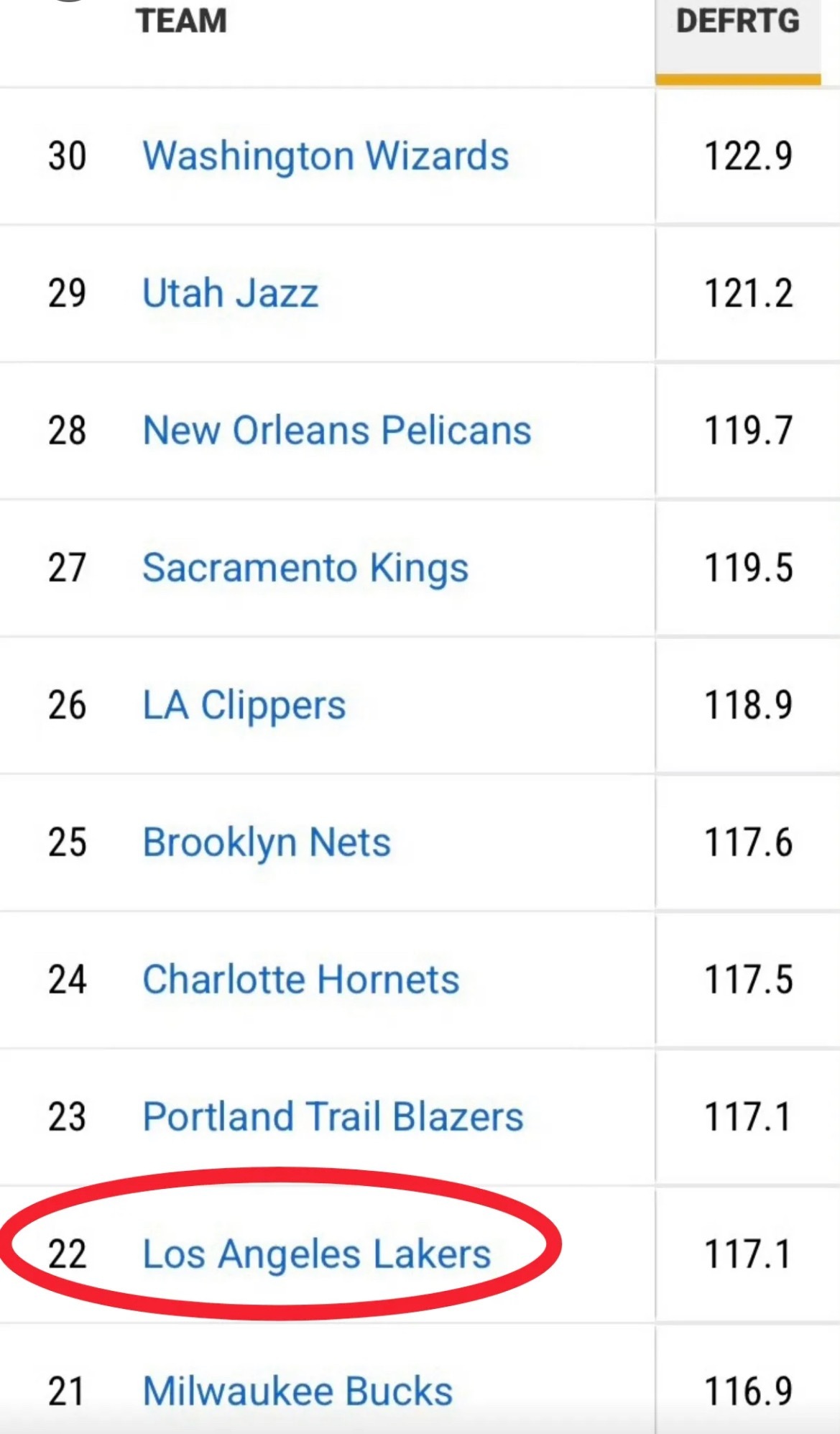 湖人现在的进攻效率排名第六,防守效率排名第二十二倒数第九!湖人国度洛杉矶湖人