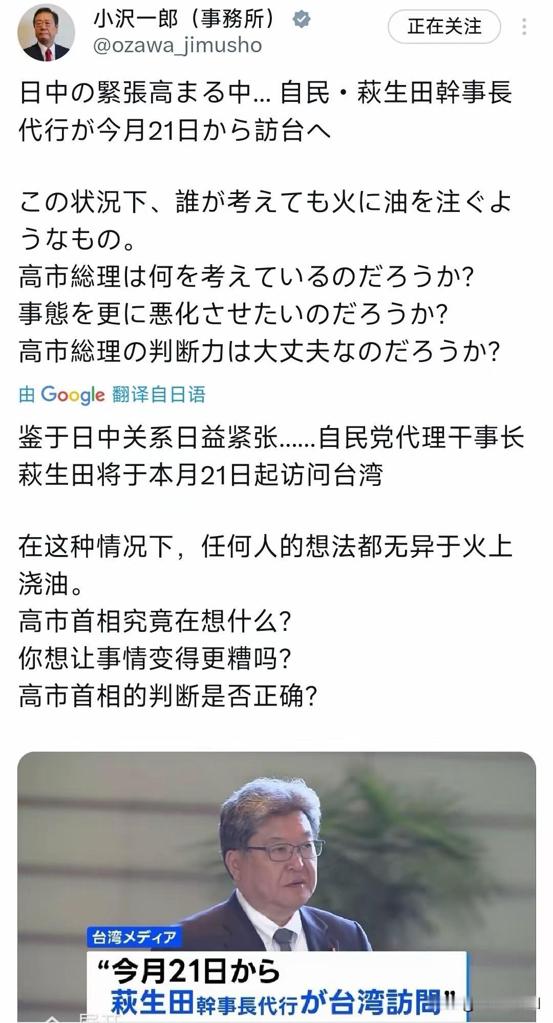 日本政客组团窜台,小泽一郎痛批"火上浇油" 近30名日本议员计划21日窜访台湾,直接把中日关系往火坑里推。自民党代理干事长萩生田光一带队,摆明了要给"台独"势力撑腰。日本政坛老江湖小泽一郎连夜发文开炮,质问高市早苗"到底想干啥",直指这种挑衅行为纯属添乱。 小泽一郎在政坛混了几十年,看问题比那些愣头青明白多了。他早就警告过高市早苗的右倾政策会惹祸,可惜现在日本政坛就缺这种明白人。要知道中国外交部已经放话,这种窜访就是破坏中日关系的"毒药"。 这事儿背后透着蹊跷。高市内阁最近支持率跌得厉害,八成是想靠打"台湾牌"转移矛盾。可他们忘了,现在解放军在台海的巡航跟上班打卡似的,日本军舰要敢凑热闹,保不齐就得吃不了兜着走。 您觉得,日本这波操作能捞着啥好处不?评论区聊聊。