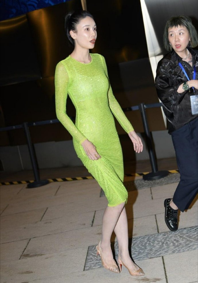 张蓝心紧身绿色包臀裙!