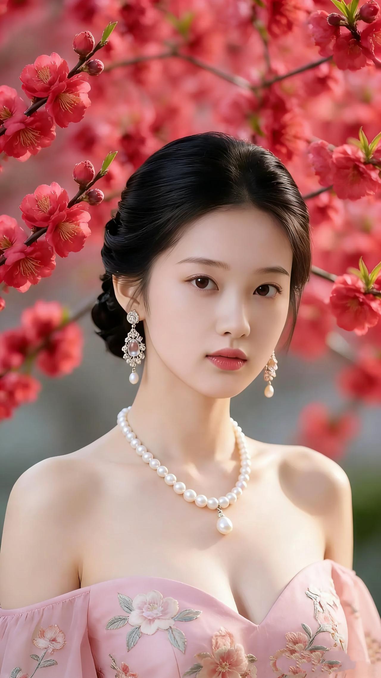 《绯花伴里的春柔》 绯色花枝轻垂肩头时,她抬眼的弧度柔得像落瓣轻晃。 粉裙绣纹里的花沾着春的润,随肩线舒展,珍珠颈链坠着的柔光,和耳间银饰的细碎光泽相缠,落在鬓边的发涡里。 身后花簇是浸了暖意的红,衬得她眉目似被春雾轻裹——没有浓烈的艳,是淡拢的柔,连唇间那点粉都温得恰好。风掠过花枝,瓣尖擦过耳侧,她眼尾的轻和,便与这春融成了一帧软景。 春最妥帖的模样,从不是花团拥簇的闹,是这绯花轻伴间,藏着的、漫开的温软。 春日柔韵 花下佳人