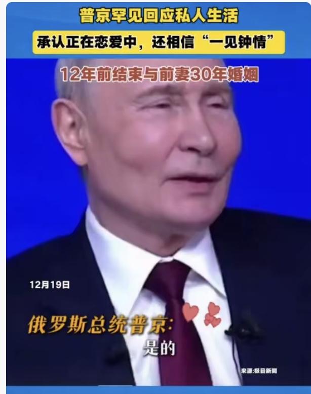重磅消息! 73岁的普京在莫斯科年度记者会上, 居然首次公开承认自己正在恋爱中! 12月19号的记者会上,有女记者逮着机会问他:“您说过相信一见钟情,那您现在恋爱了吗?”普京直接笑着回了句“是的”,这下可把全场都惊到了! 要知道普京和前妻柳德米拉2013年离婚后,单身都十来年了,不管是出访还是参加活动,基本都是孤身一人,对私人感情更是绝口不提。这次突然松口承认恋爱,属实是打破了多年的沉默。 不过普京没说恋爱对象是谁,外界猜来猜去,最受关注的还是前体操冠军卡巴耶娃,但克里姆林宫只说要尊重普京的私人生活,没再多透露半个字。 你觉得普京的恋爱对象会是谁?