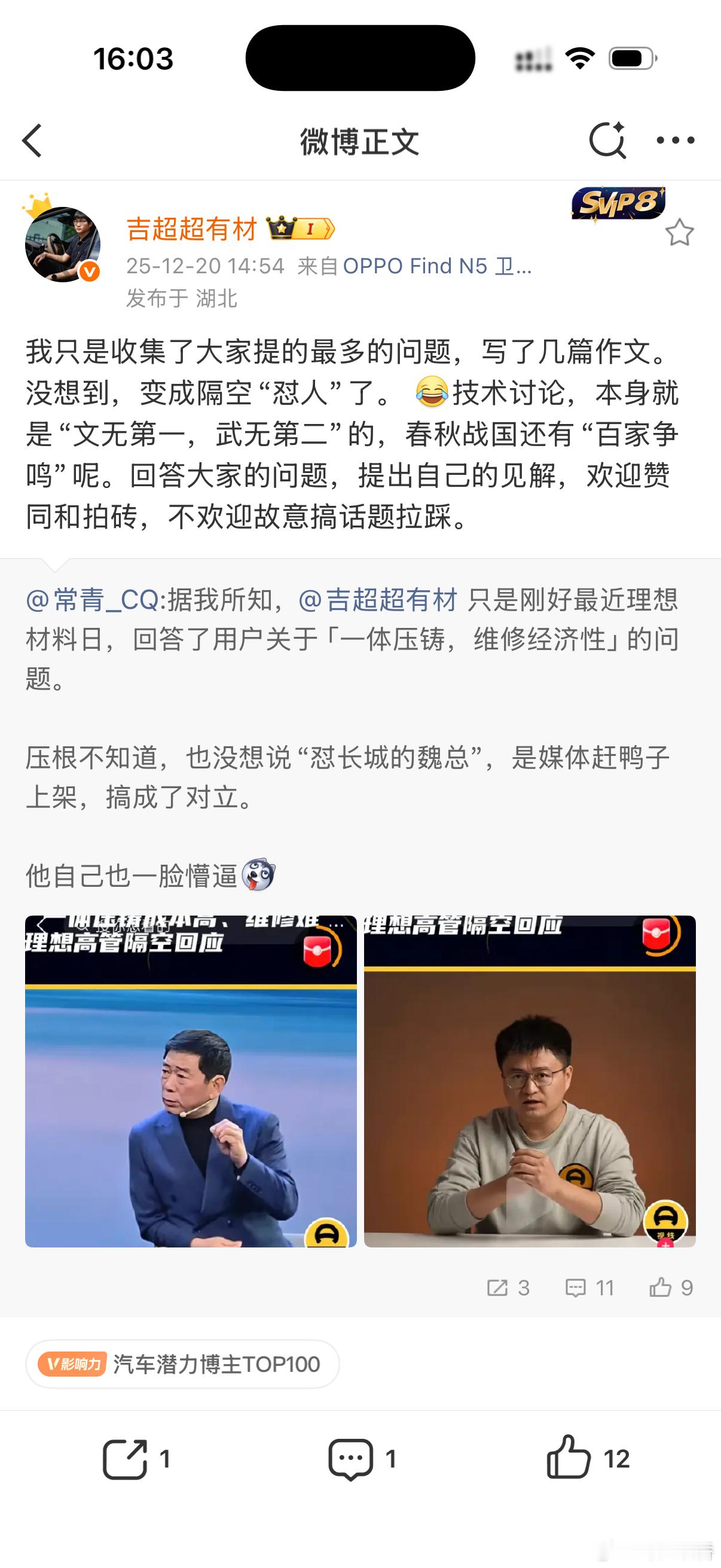 懂车帝太离谱了,强行把长城魏总 的发言和理想 回答用户提问的内容做嫁接,得出理想高管回怼魏总的新闻快报牛批牛批!懂车帝的流量能力真的无敌!