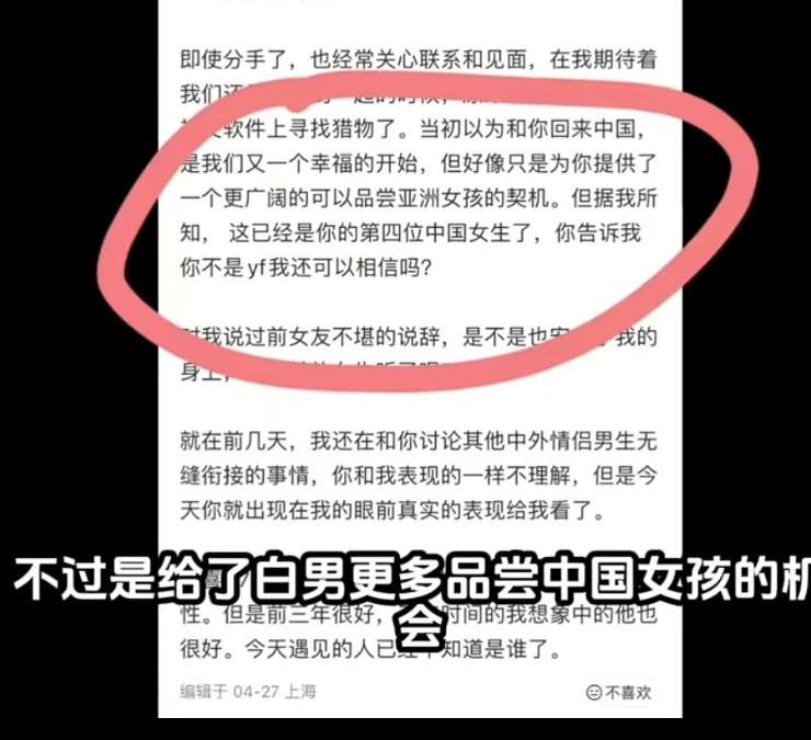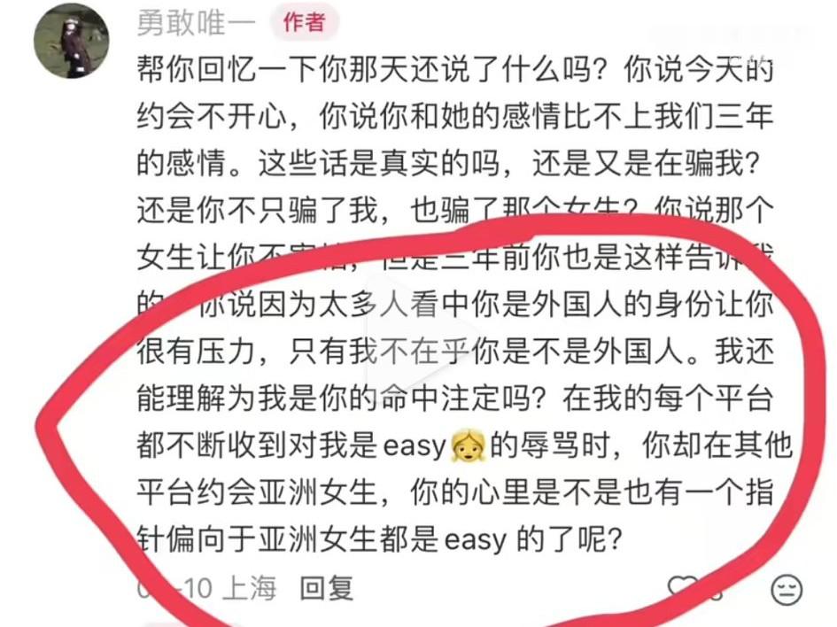 上海女生留学认识外国男友,带男友回国后帮他找了一份很好的工作,没想到被男友劈腿…… 据这位女生自述,当她发觉男友劈腿的时候,这个男友已经找了四个中国女生了,她是在路上遇到他和其中一个女生的时候,才知道被劈腿了。而且那个女生应该是知三当三的。 评论区网友吐槽:这完全是引狼入室啊,不过有些女的是硬贴上去的,怪不得人家外国男的! 大家怎么看?