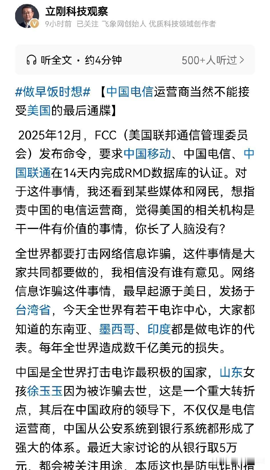 项立刚痛批,美国对中国三大电信运营商最后的通牒。 并指责某些媒体和网民还对此欢呼雀跃,认为是没有长脑子的表现。 他觉得美国自己的电信运营商都没有做到对电信诈骗的识别拦截,而且在美国电诈会更严重,毕竟是在这里起源的。 之所以在如此短的时间内要求中国电信运营商做到拦截电诈,完全是为了打压,排挤,因此,完全没必要理会和配合。 听他这么一说,真的不知道哪一方做的是对是错了。